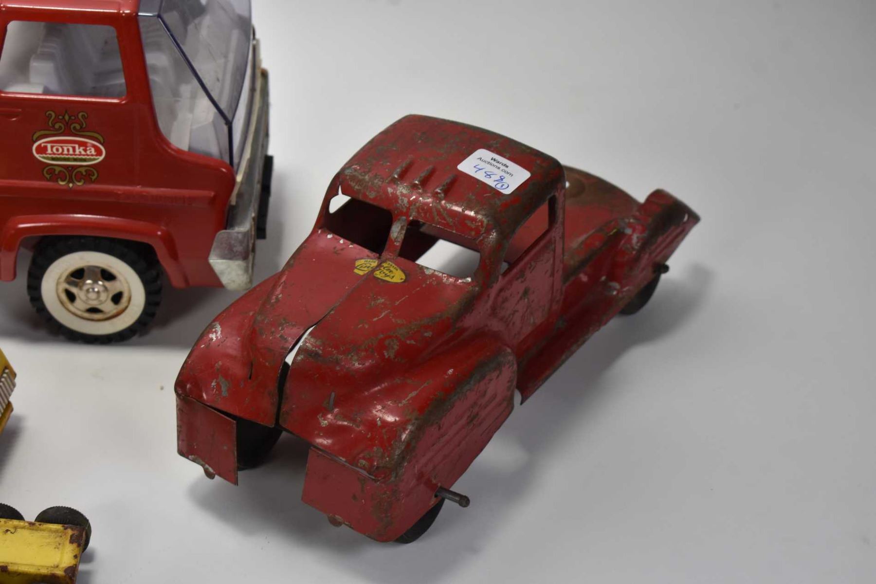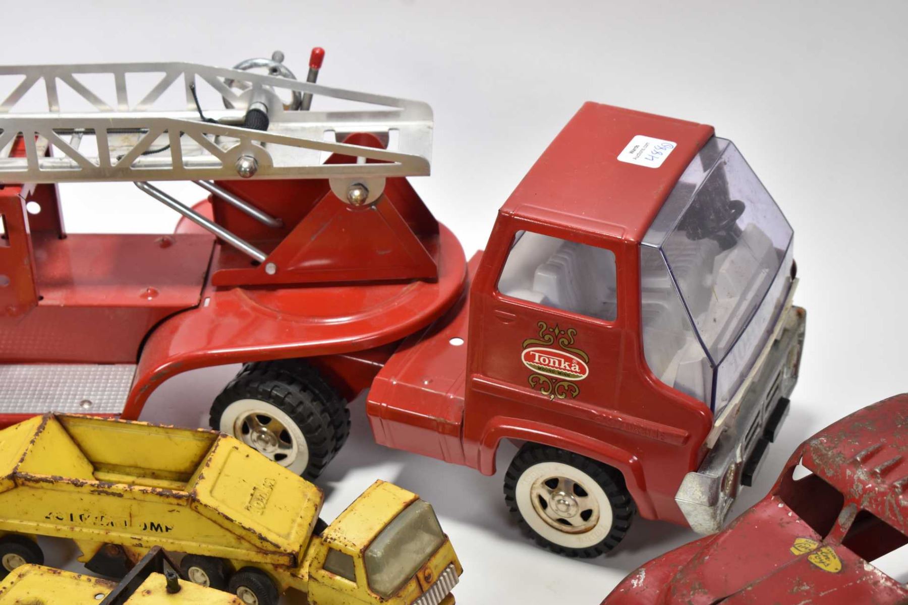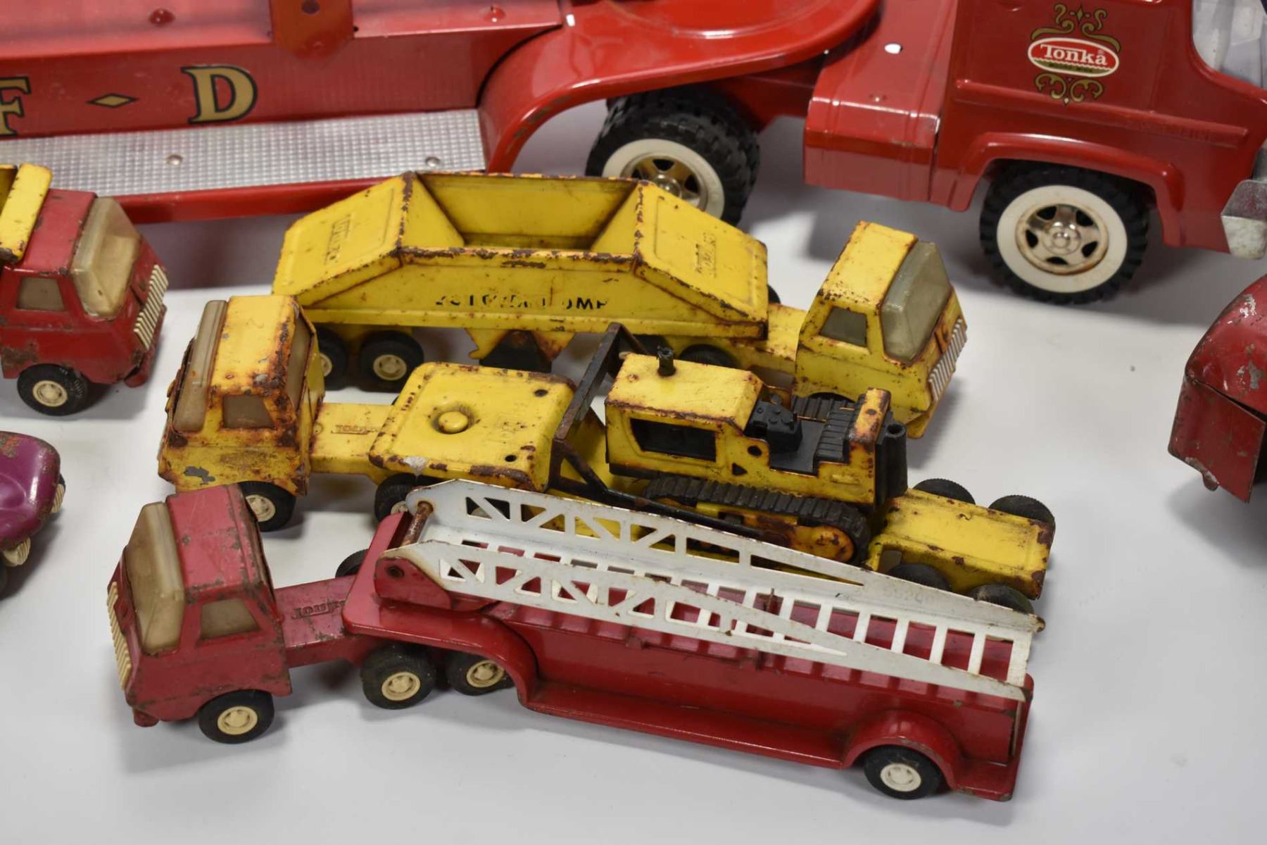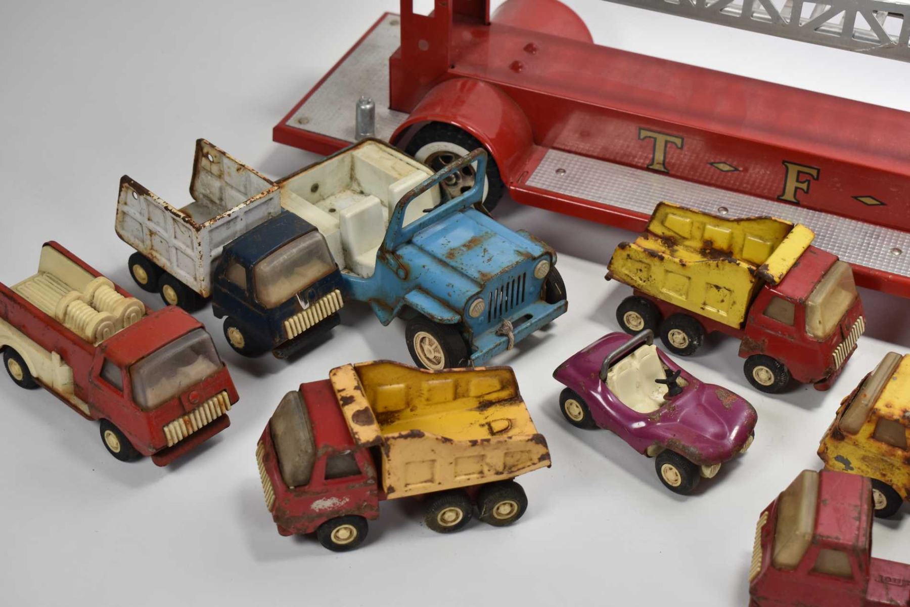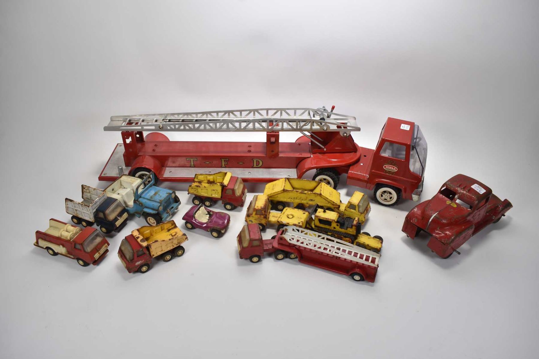 Selection of vintage stamped steel toys including 30" long Tonka ladder truck, Lincoln highway tractor, plus smaller Tonka and similar vehicles