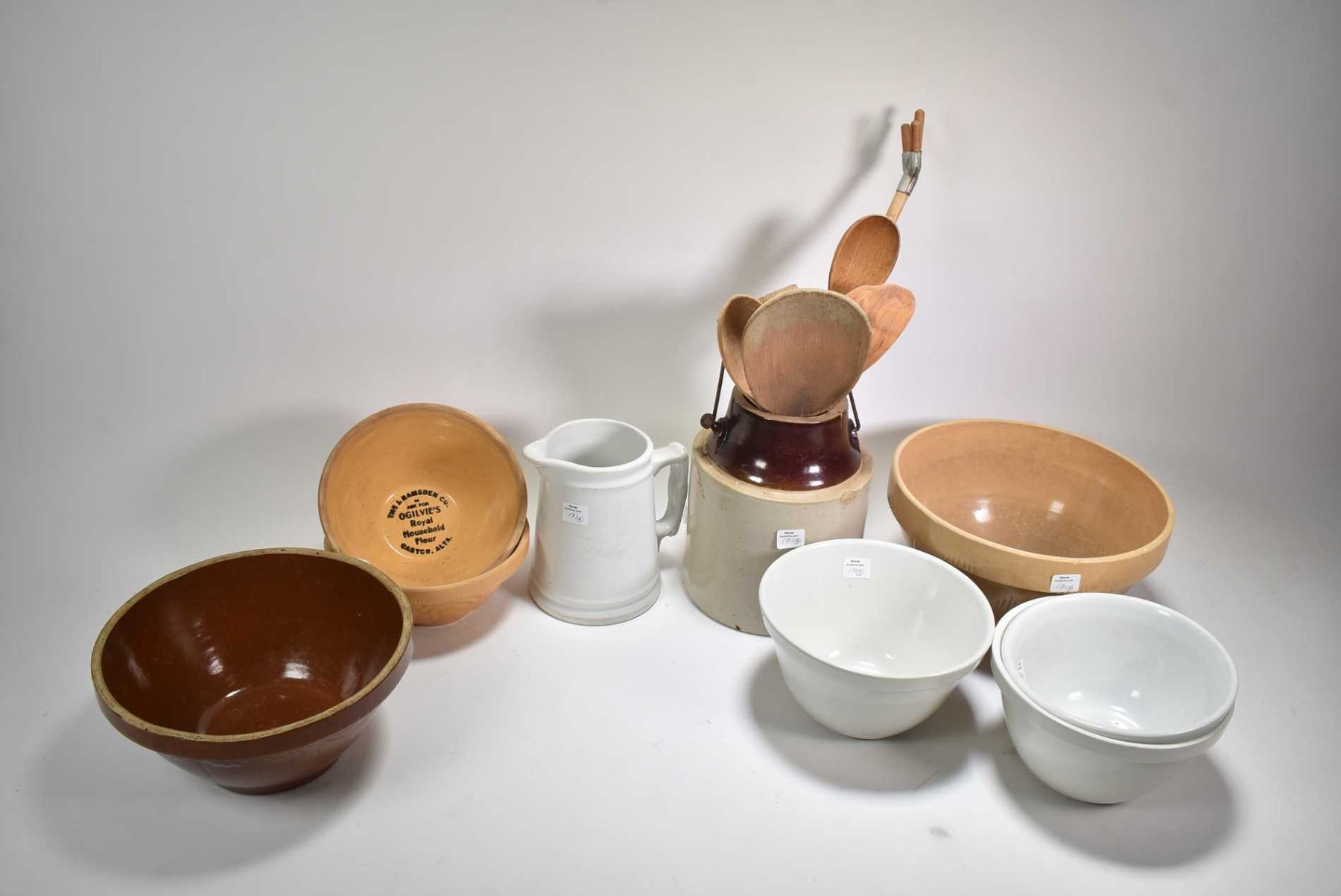 Selection of vintage stoneware and pottery including two 8" diameter miniature advertising mixing bowls "Ask for Ogilbie's" one for Castor AB and one for Leduc AB, a Wood & Son's ironstone pitcher, stoneware mixing bowls, Adams & Son pudding bowl plus a bean pot with some wooden utensils etc.