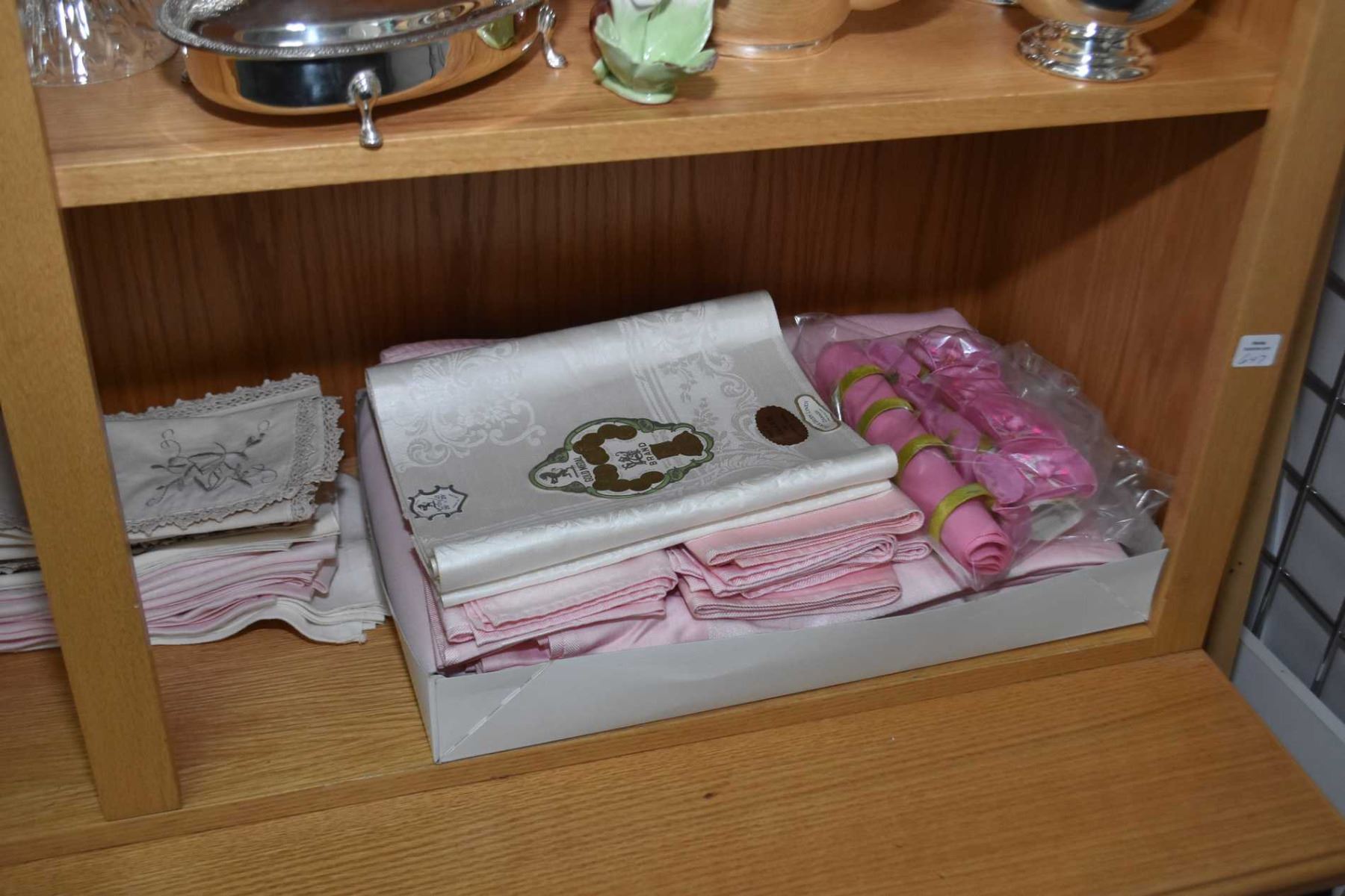 Selection of vintage table linens including Irish linen, damask tablecloths, embroidered cloth, croc