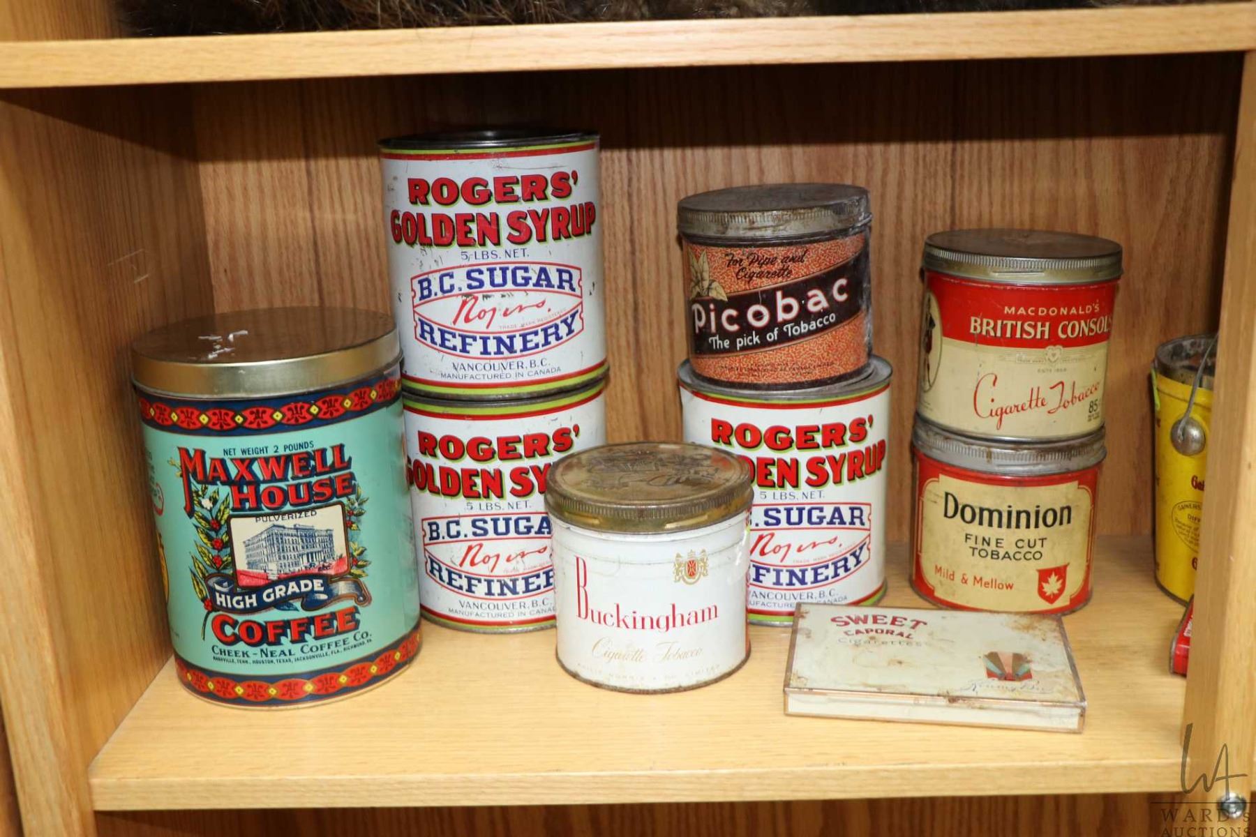 Selection of vintage tins including tobacco tins, Maxwell house, Sweet Caporal Tobacco, Will's Fine Cut Tobacco, British Consuls tobacco etc. Note: Not available for shipping. Local pickup only