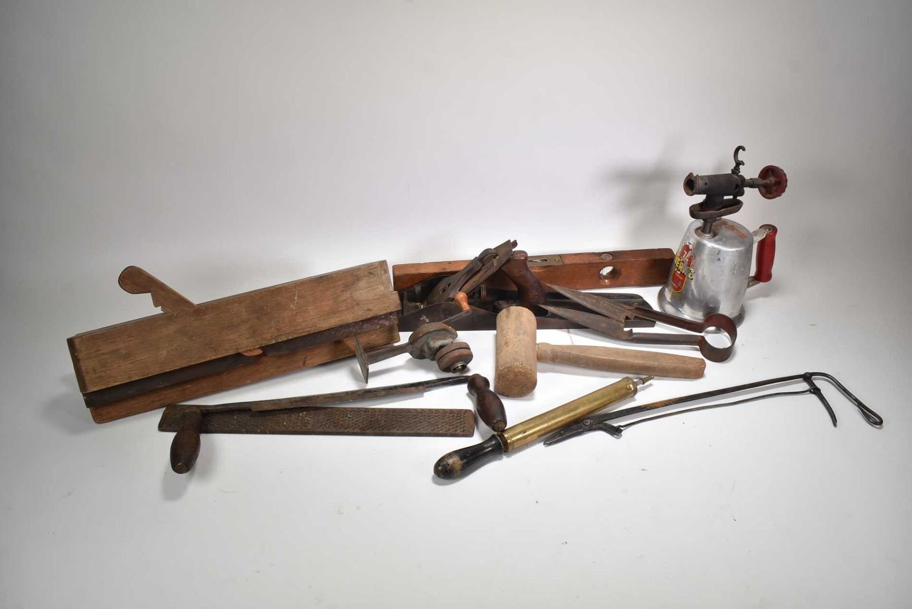 Selection of vintage tools including wooden clamp on edging tool, No. 7 metal plane, wooden spirit level, aluminium torch, hand knife sharpeners, sheep shears, wooden mallet etc.