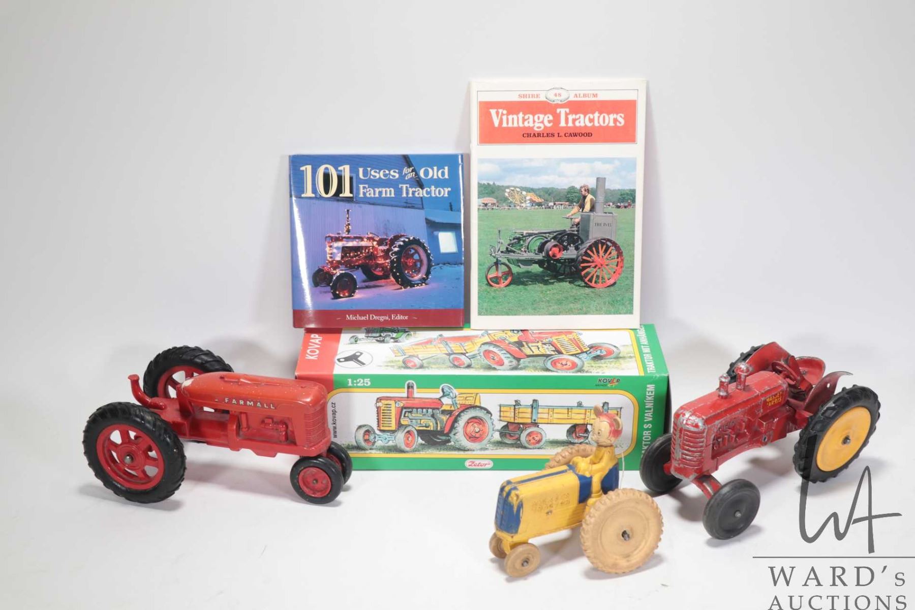 Selection of vintage toy tractors including rubber Mickey Mouse tractor, rubber Farmall tractor, diecast Massey-Harris tractor plus a new in box tin wind up toy tractor and trailer