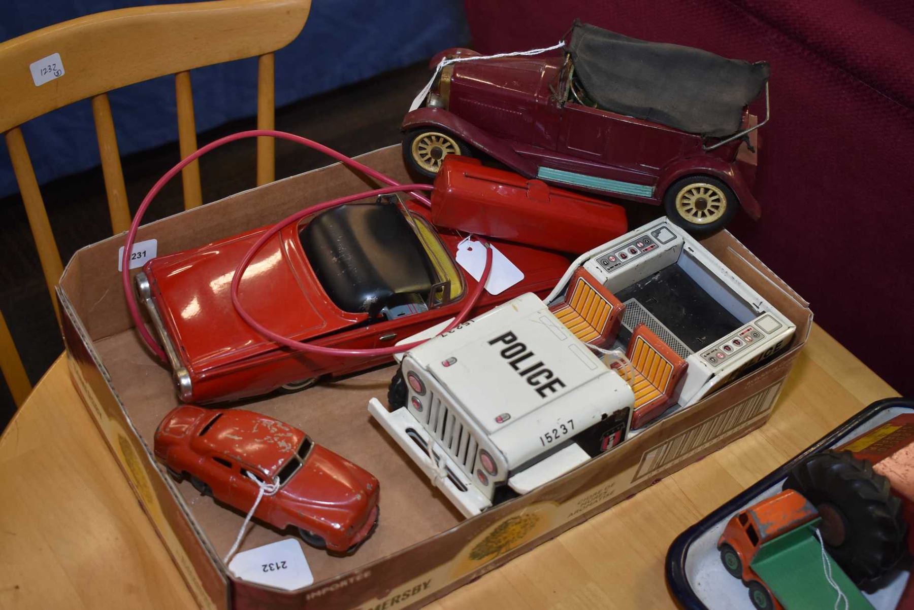 Selection of vintage toys including a remote control convertible T-bird, a Japanese made police jeep, a friction drive Japanese made roadster and a key wind Occupied Japan sedan