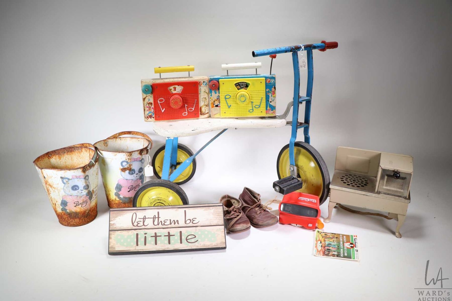 Selection of vintage toys including pedal trike, Viewmaster with four slides, FisherPrice radios, Mickey Mouse record player, 110 volt steel child's oven made by Tudhope Metal Specialties Ltd. etc.