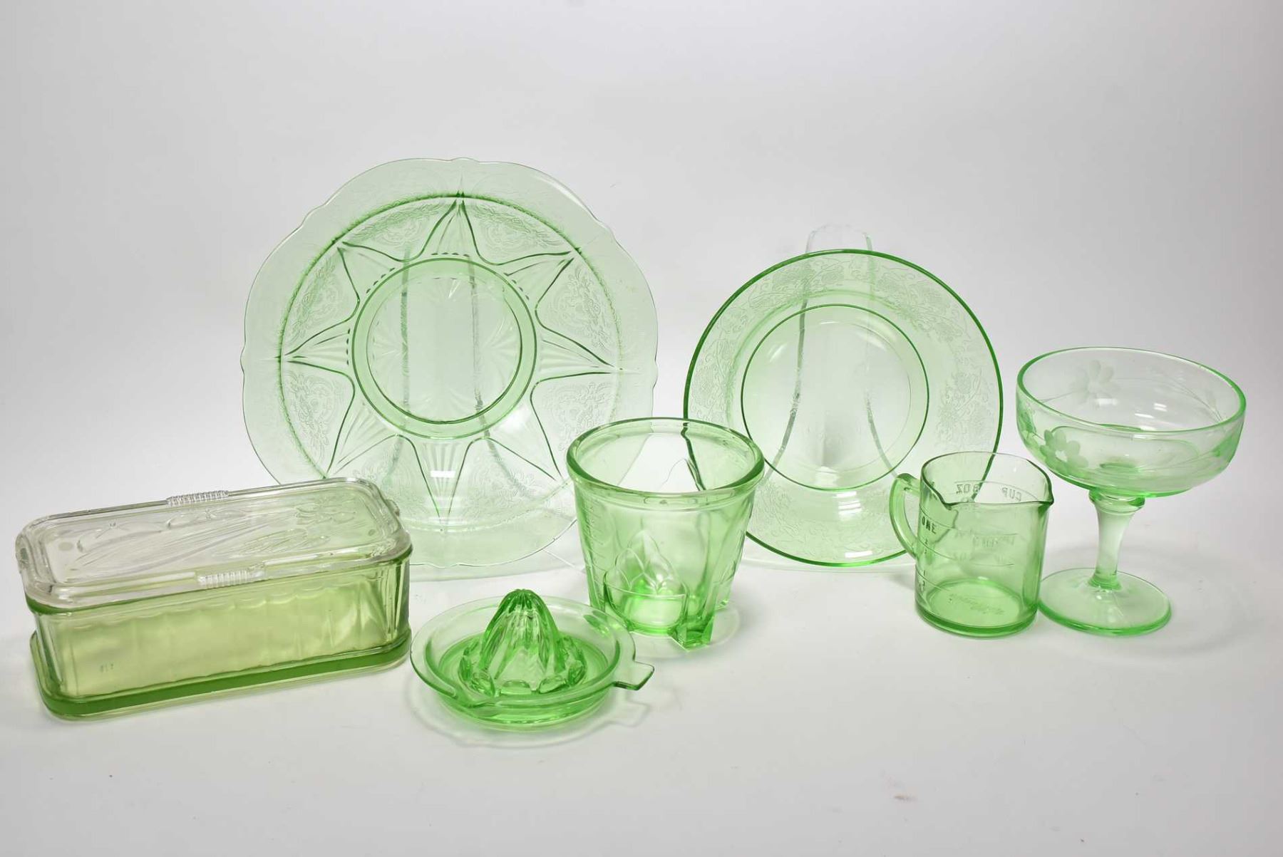 Selection of vintage uranium glass including two measuring cups, two serving bowls, lidded refrigerator box, juicer and a comport