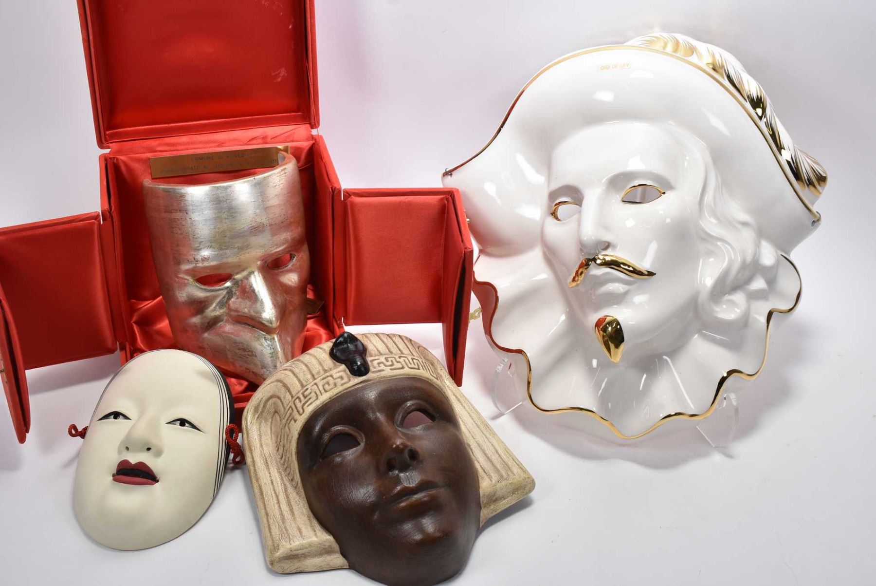 Selection of wall masks including "Oro de Ley" glazed porcelain, Gianni Cavalier signed mask in presentation box plus an Egyptian style and a Oriental mask