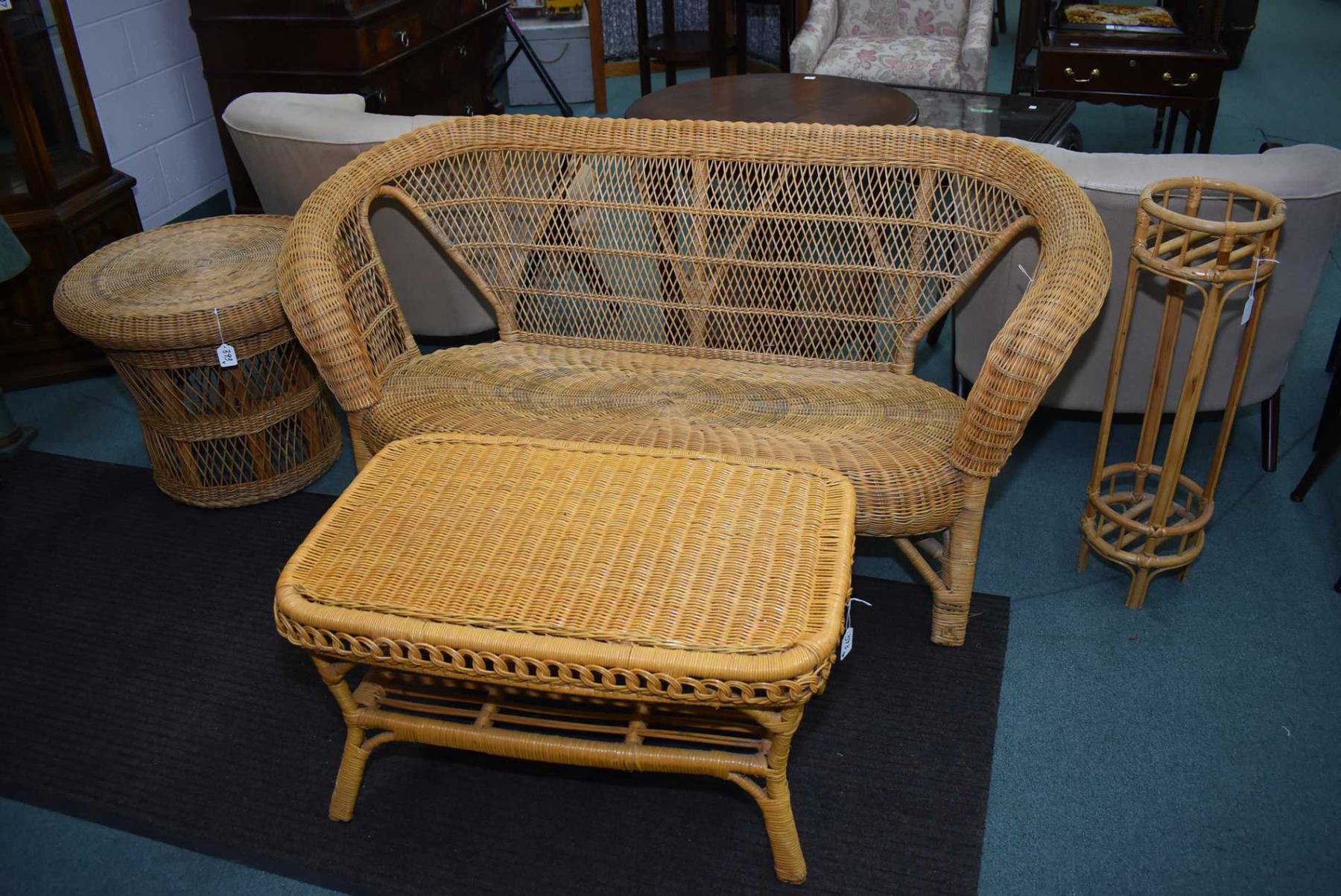Selection of wicker furniture including two seat settee, side table, coffee table and plant stand