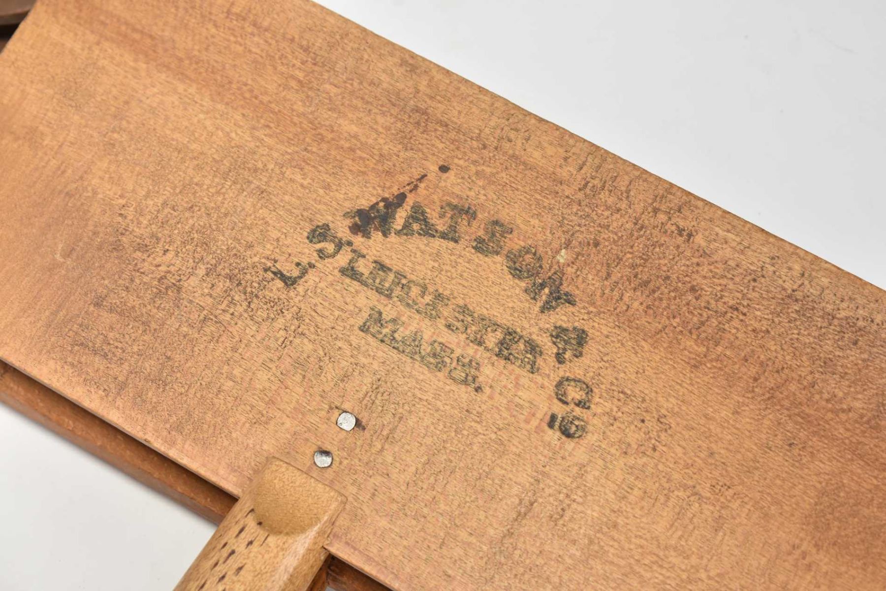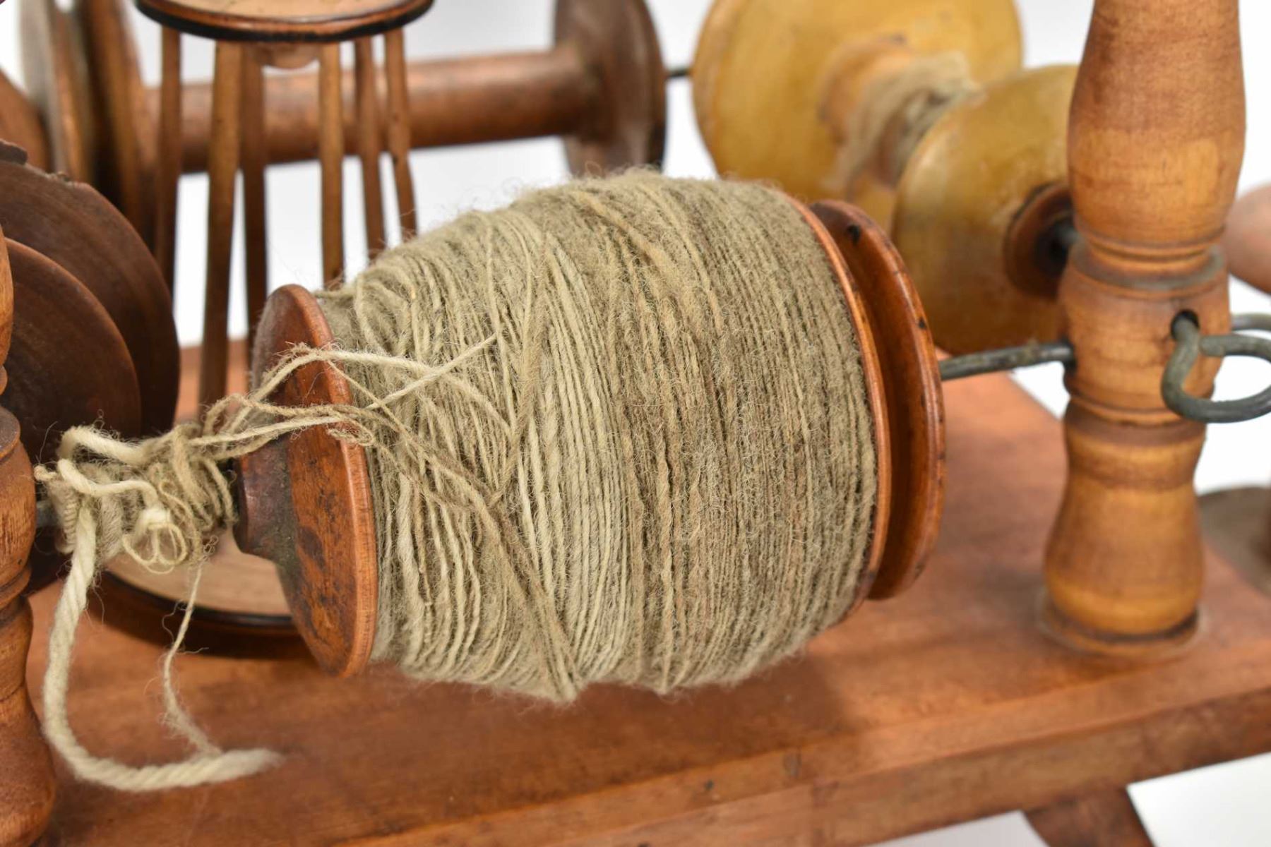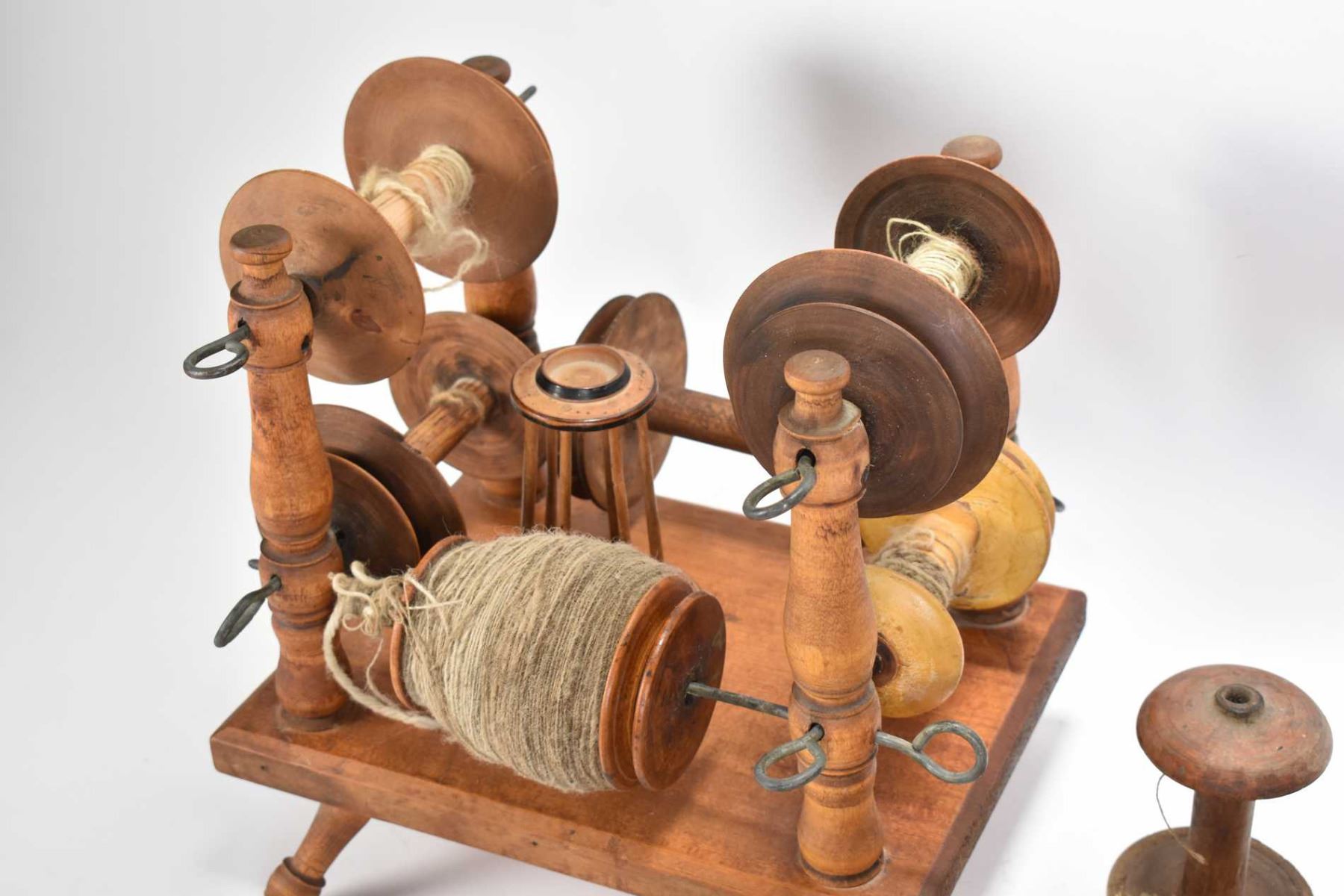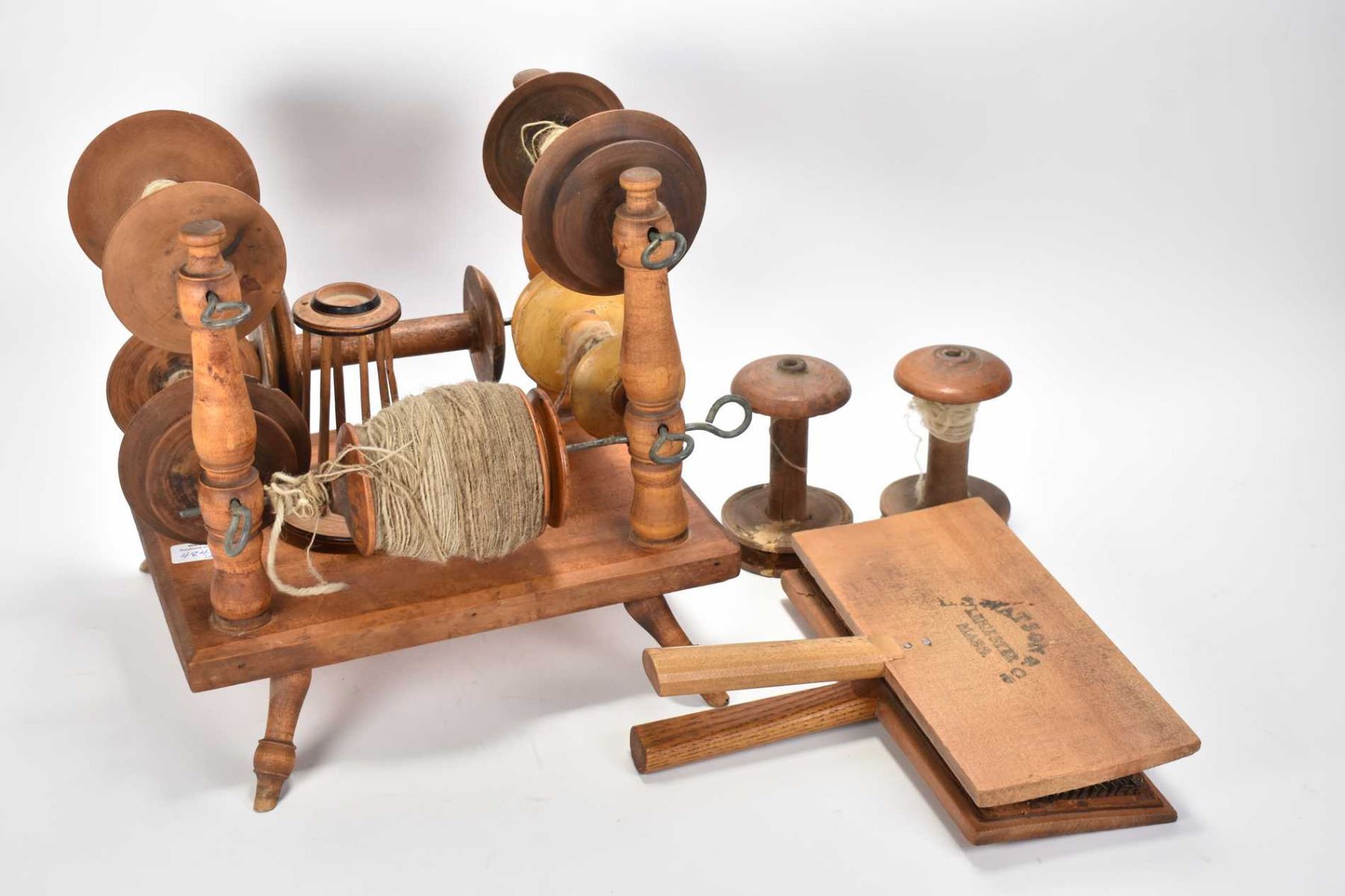 Selection of wool accessories including wool spool stand, plus two empty spools and a pair of carders "L.S. Watson & Co."
