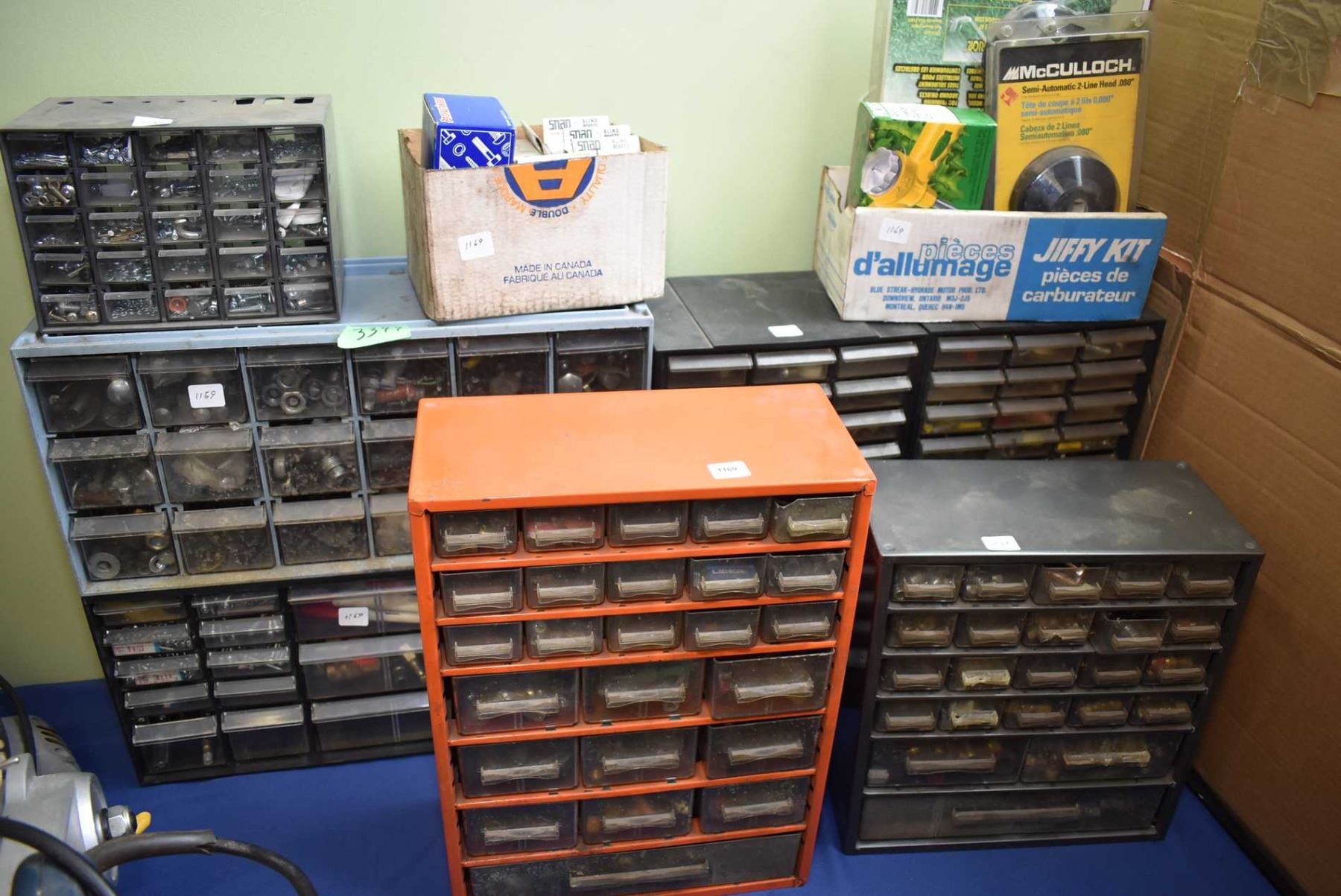 Selection of workshop organizers containing hardware, light bulbs, shrink tube, drill bits, Allen wr