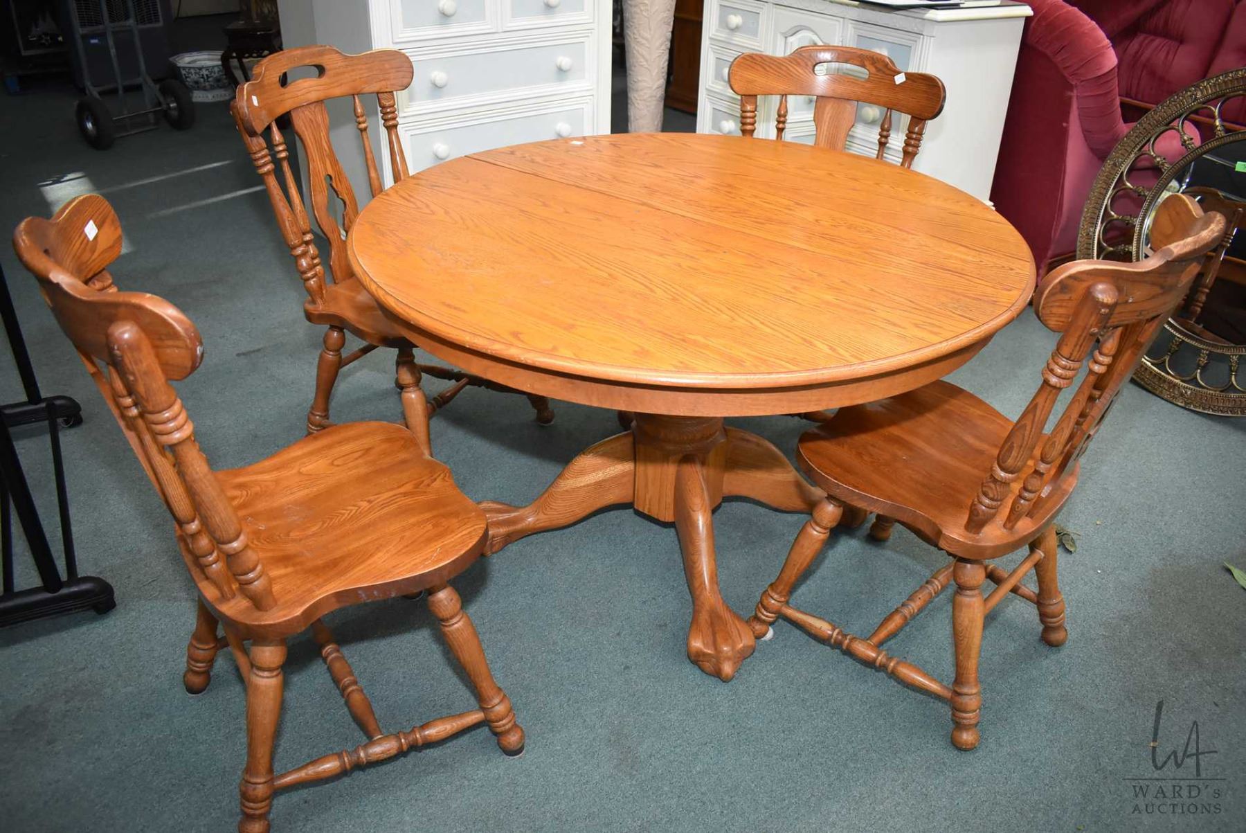 Semi contemporary 48" diameter center pedestal oak dining table with carved paw feet plus a set of four oak dining chairs