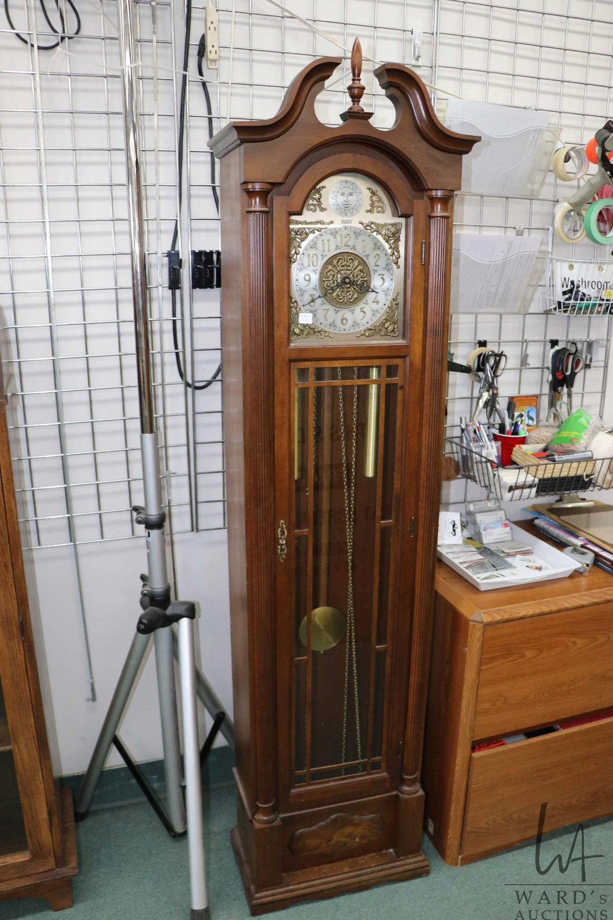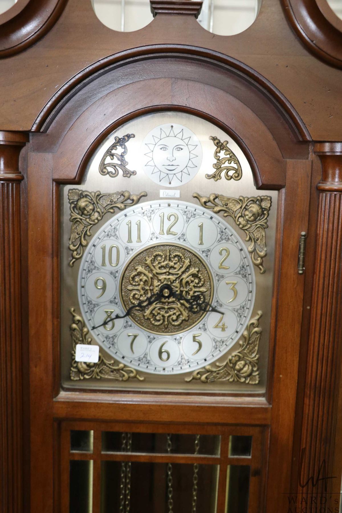 Semi contemporary American made triple train, floor standing clock. Clock movement working at time of cataloguing. Chime not working at time time. 74" in height.