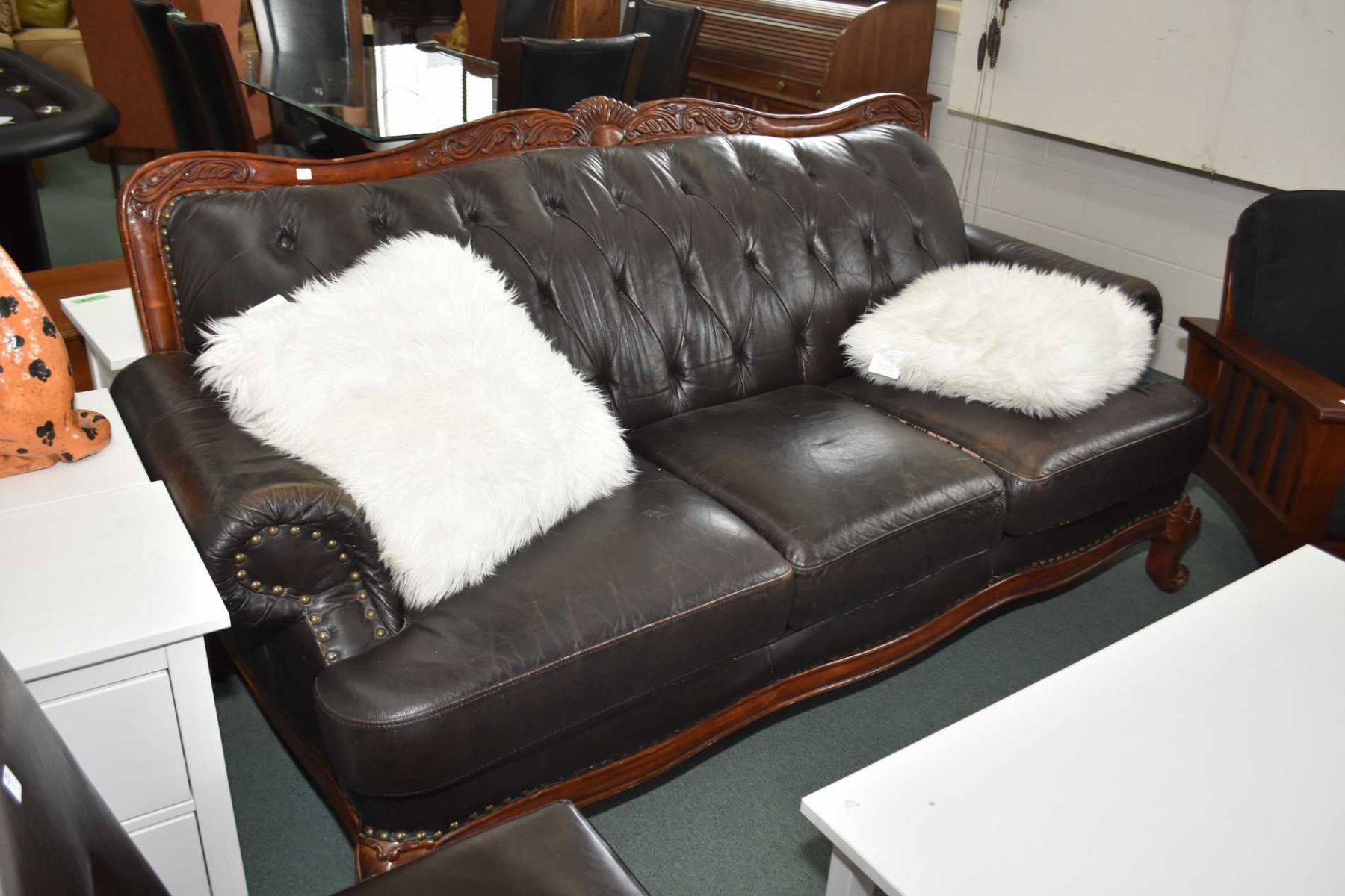 Semi contemporary button tufted full sized sofa with decorative show wood plus two decorative pillows