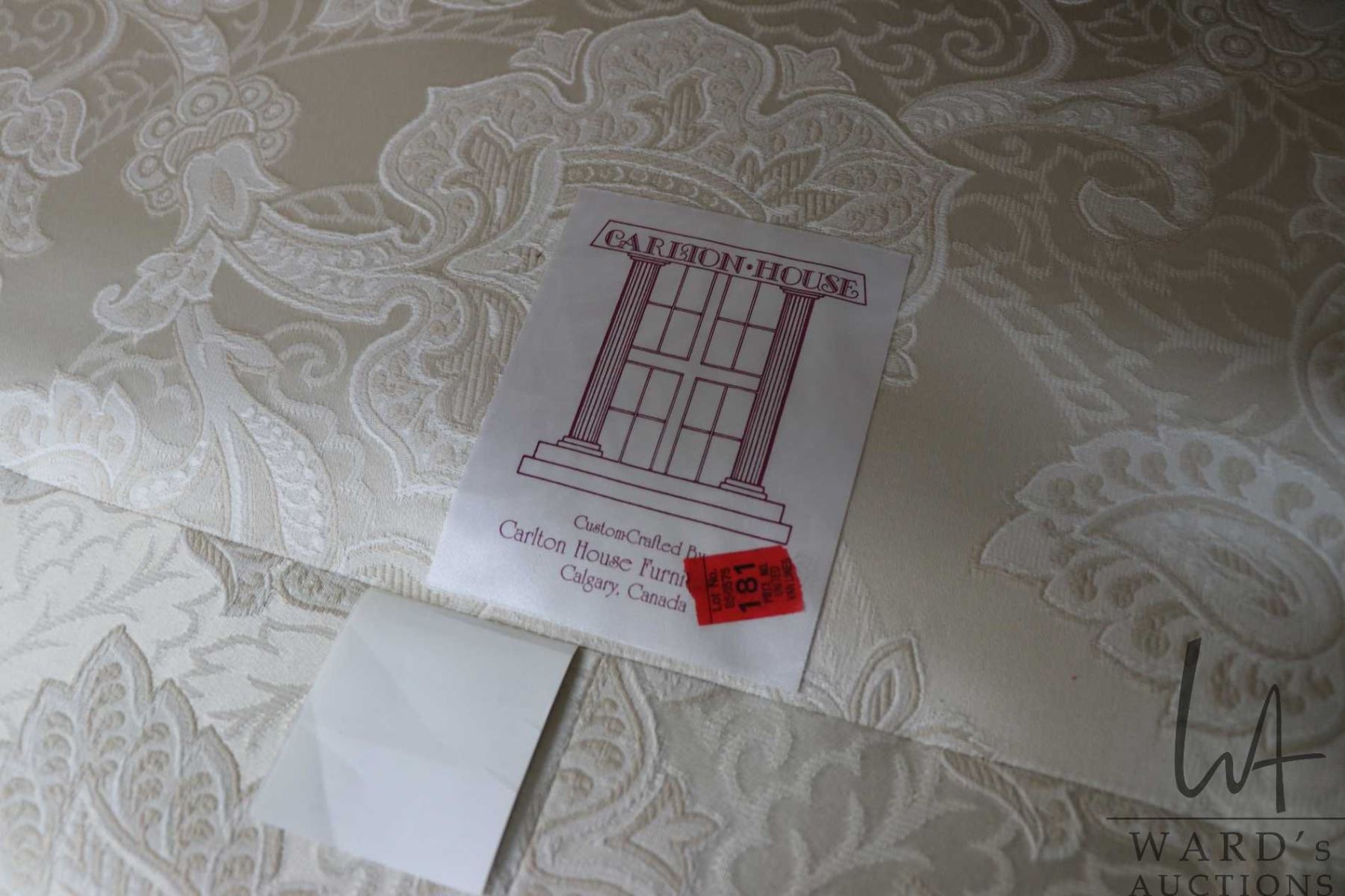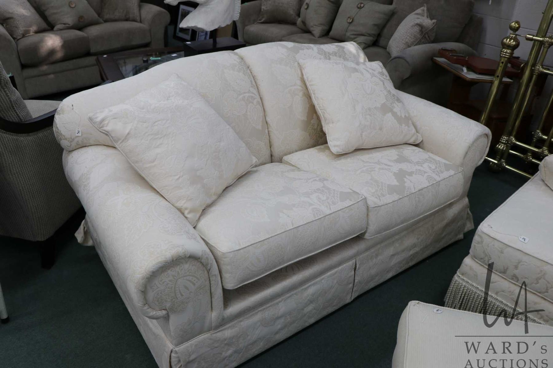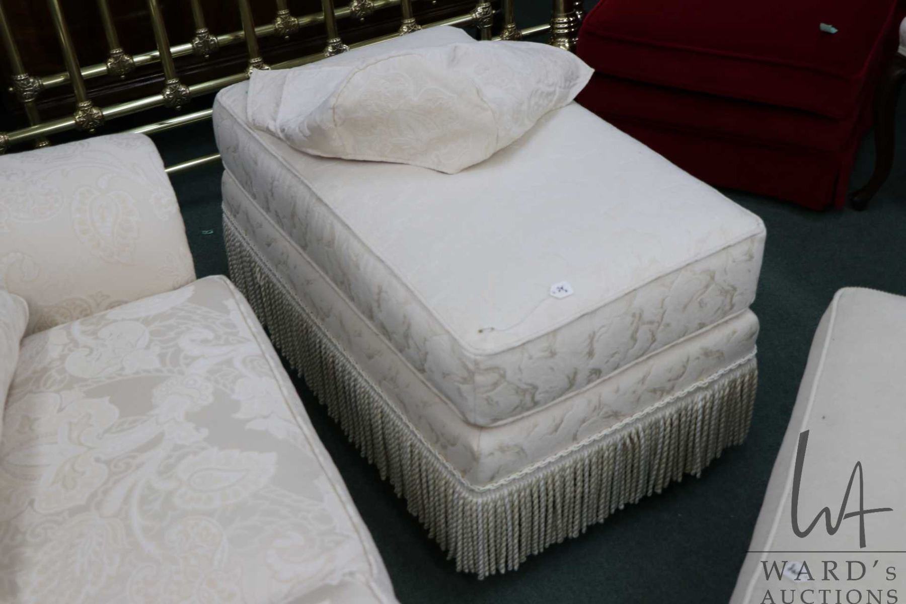 Semi contemporary cream and white upholstered love seat by Carleton House plus a rope fringed ottoman