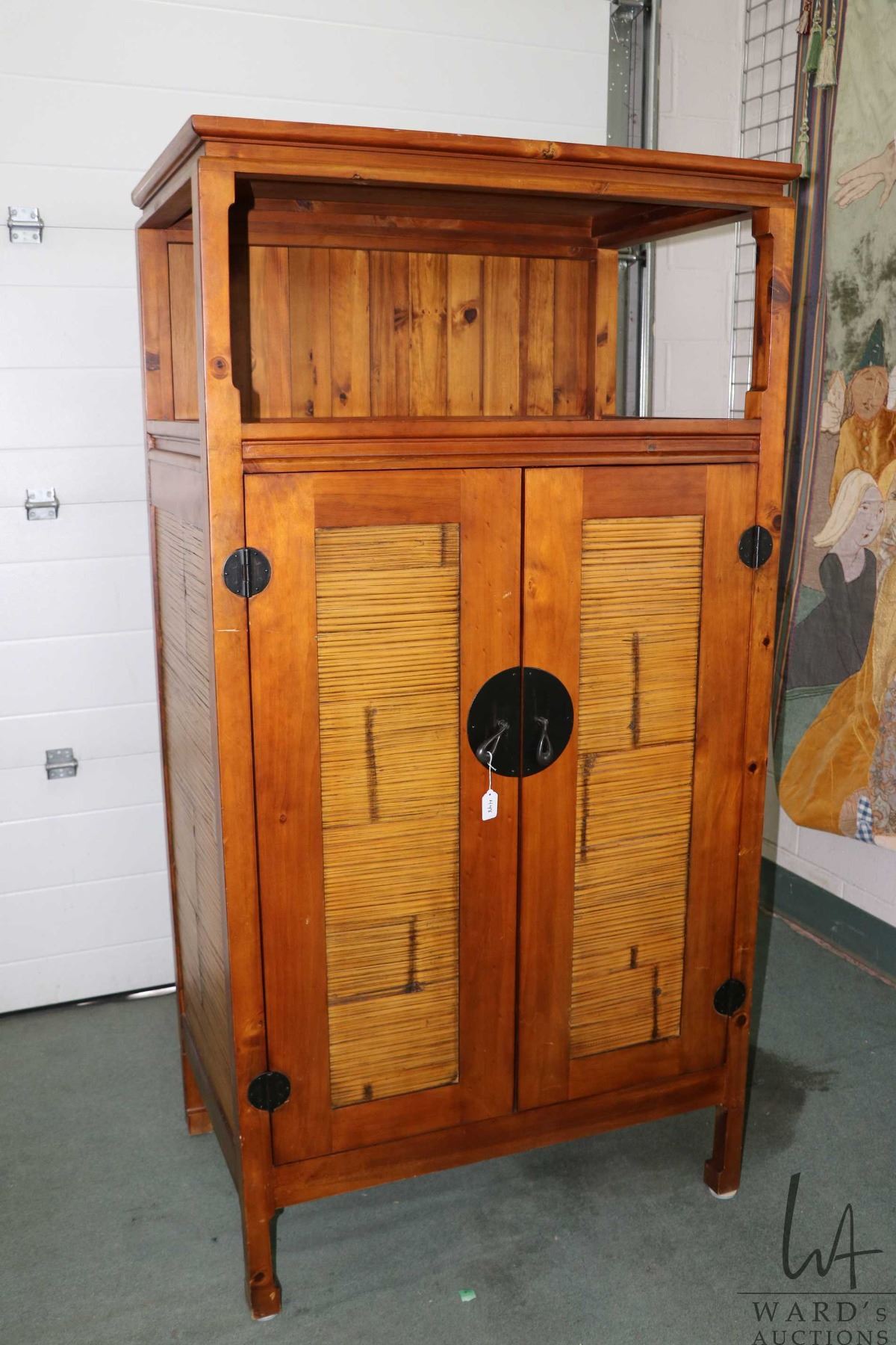 Semi contemporary entertainment unit with two doors inset with bamboo, hand hammered hardware, fitted with drawer and shelves, easily modified to use as chiffarobe, 73" X 37" X 25"