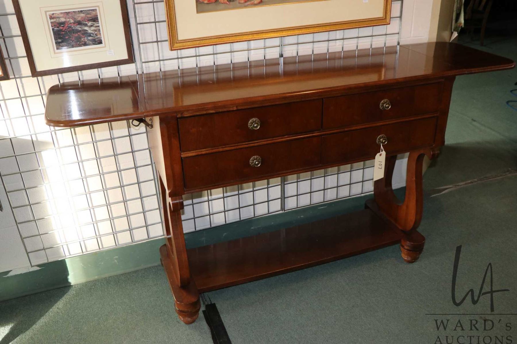 Semi contemporary four drawer server made by Broyhill with lyre supports, 49" wide plus two 12" drop leaves, 19" deep and 38" in height