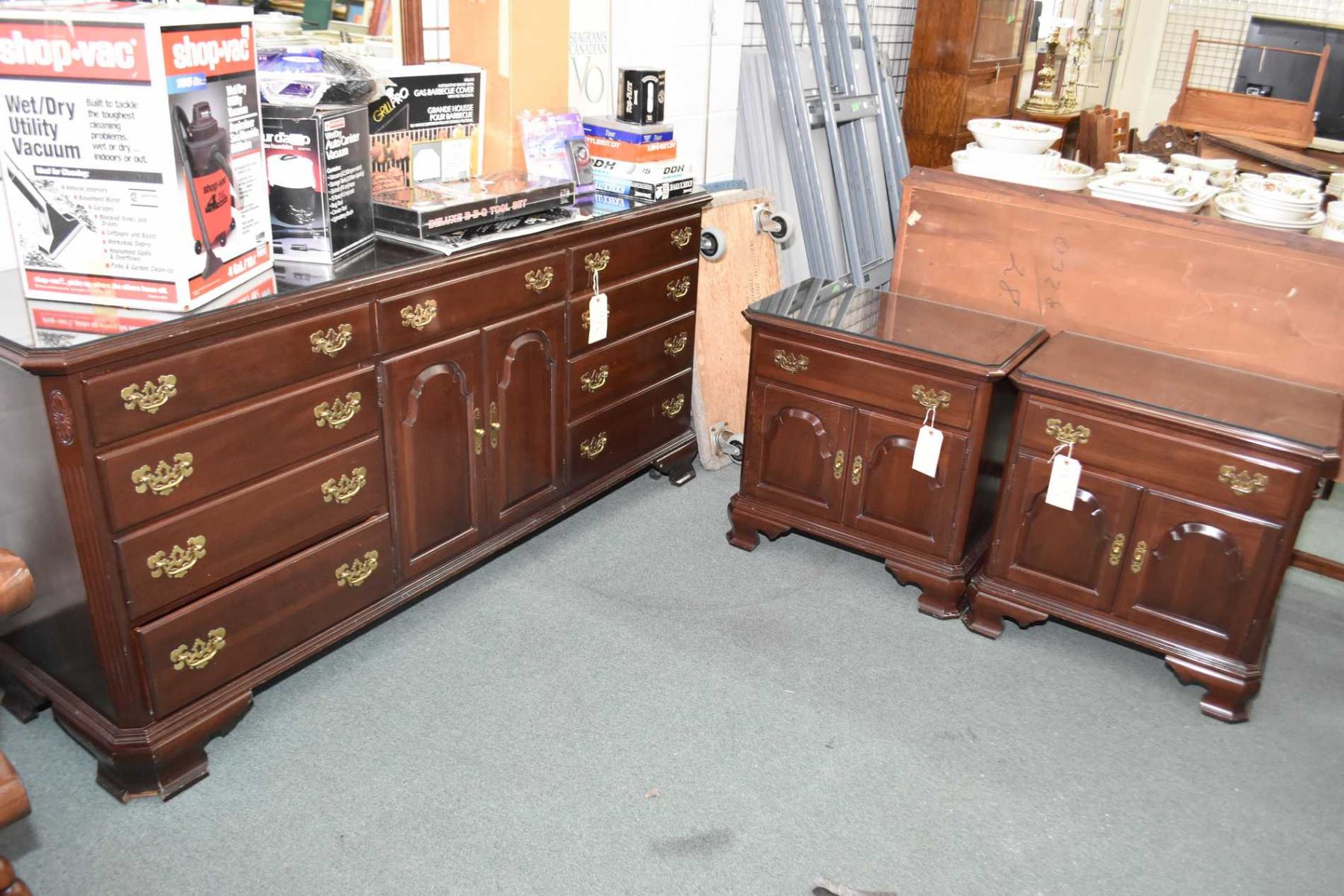 Semi contemporary nine door and two drawer dresser and a pair of matching nightstand, plus a matching wall mirror and glass top protectors for all