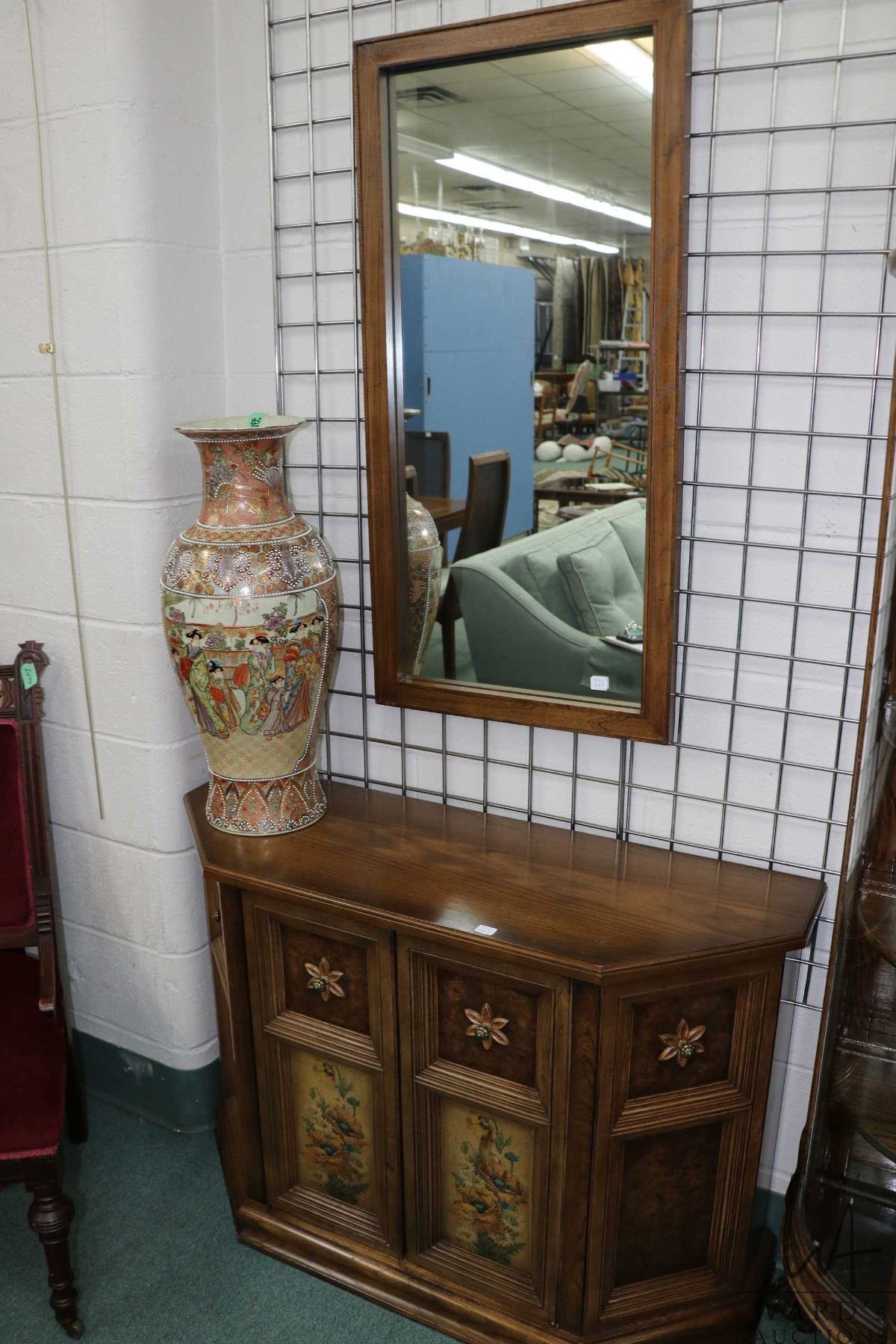 Semi contemporary oak flat to the wall console with two floral scene raised panel doors. Measures 29" high, 41" wide and 14" deep. Plus matching wall mirror.