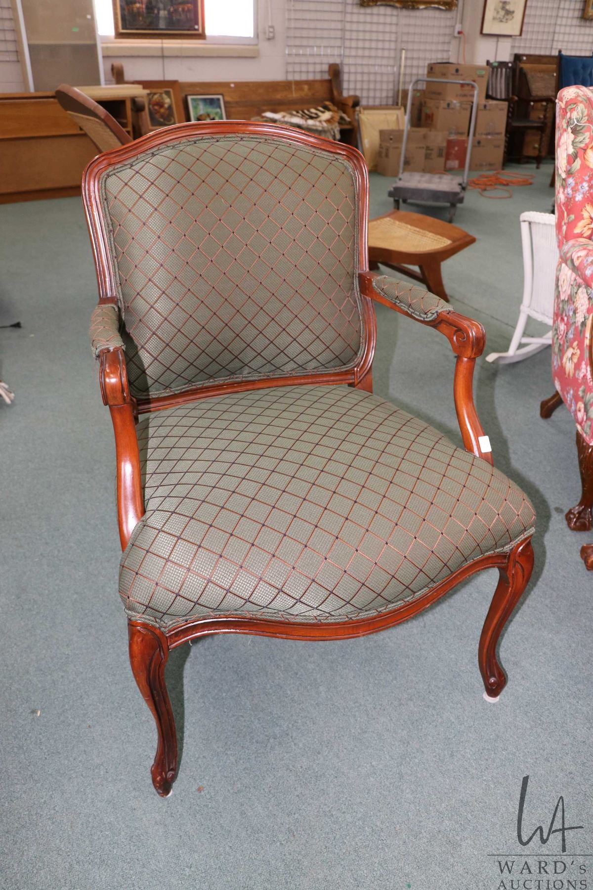 Semi contemporary open arm parlour chair with upholstered seat, back and elbow pads, on cabriole supports