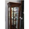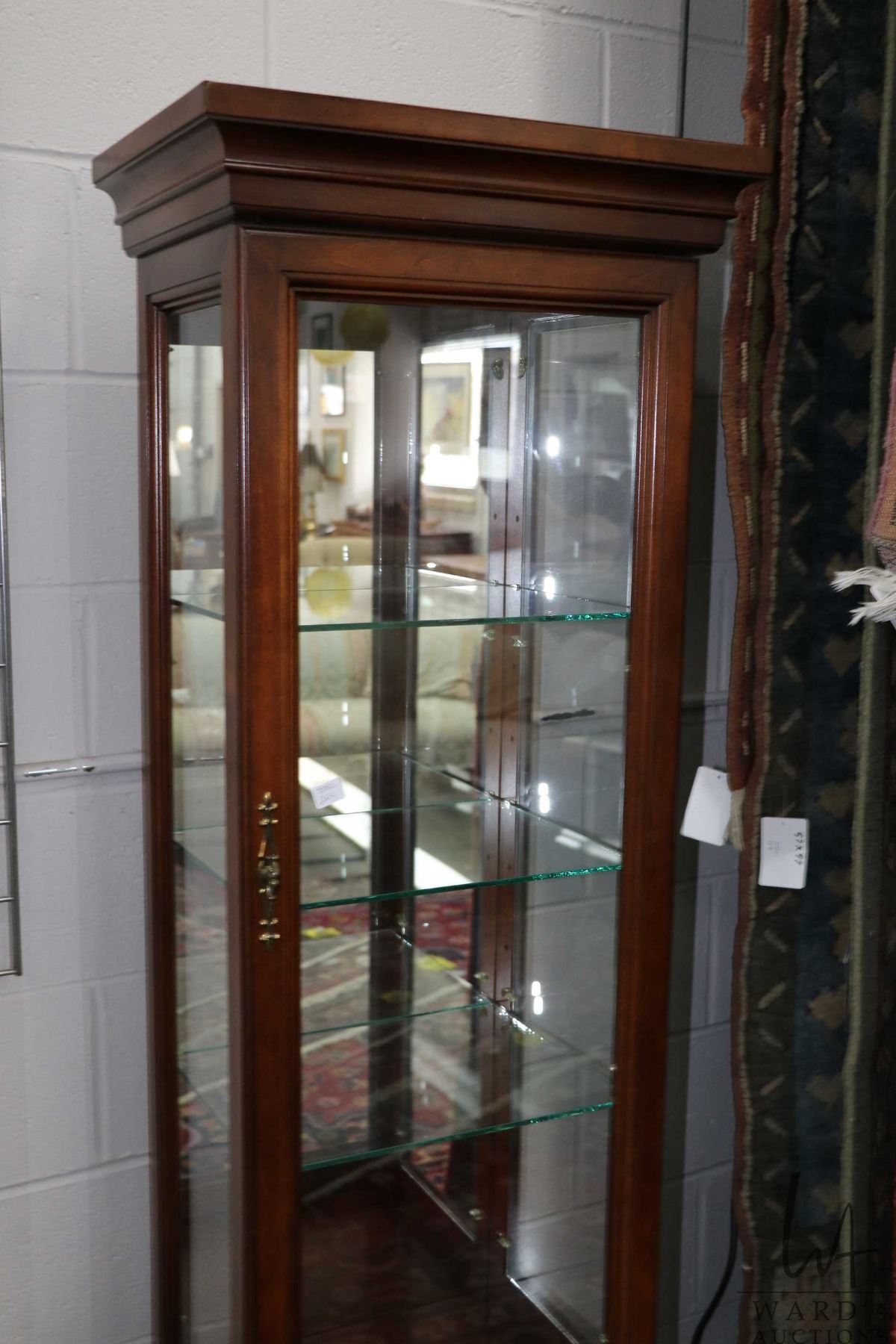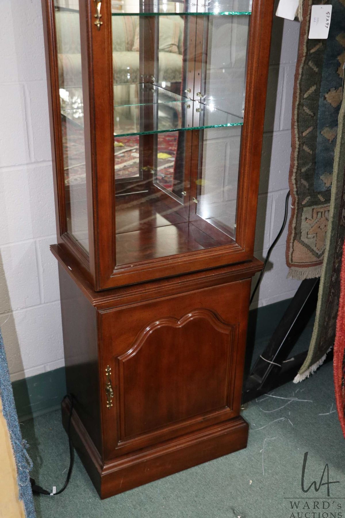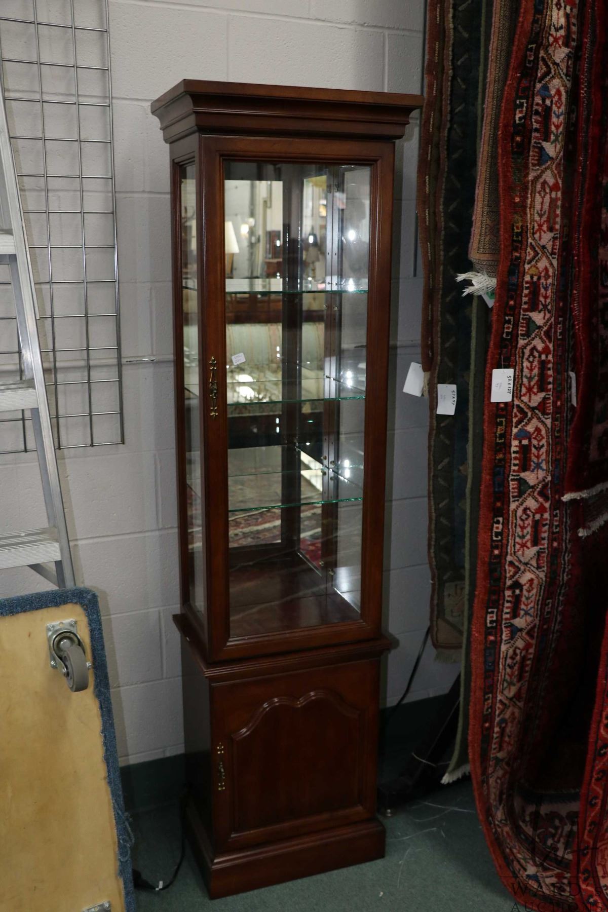 Semi contemporary two door illuminated curio cabinet with display upper section fitted with glass shelves and mirror with storage in base, made by Strathroy, 70" H X 19" W X 14" D