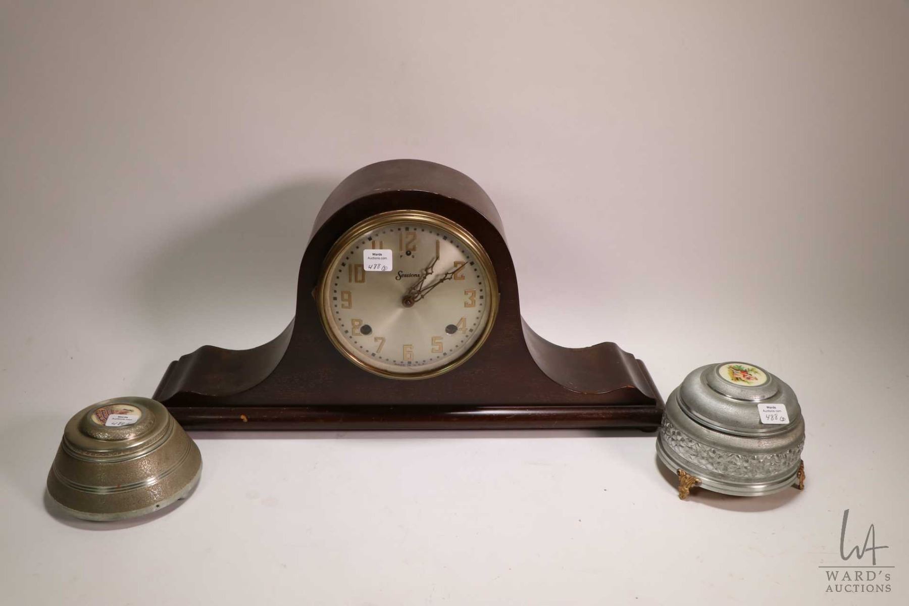 Session top hat mantle clock, working at time of cataloguing, note access door has been replaced and two musical dresser boxes, one not working