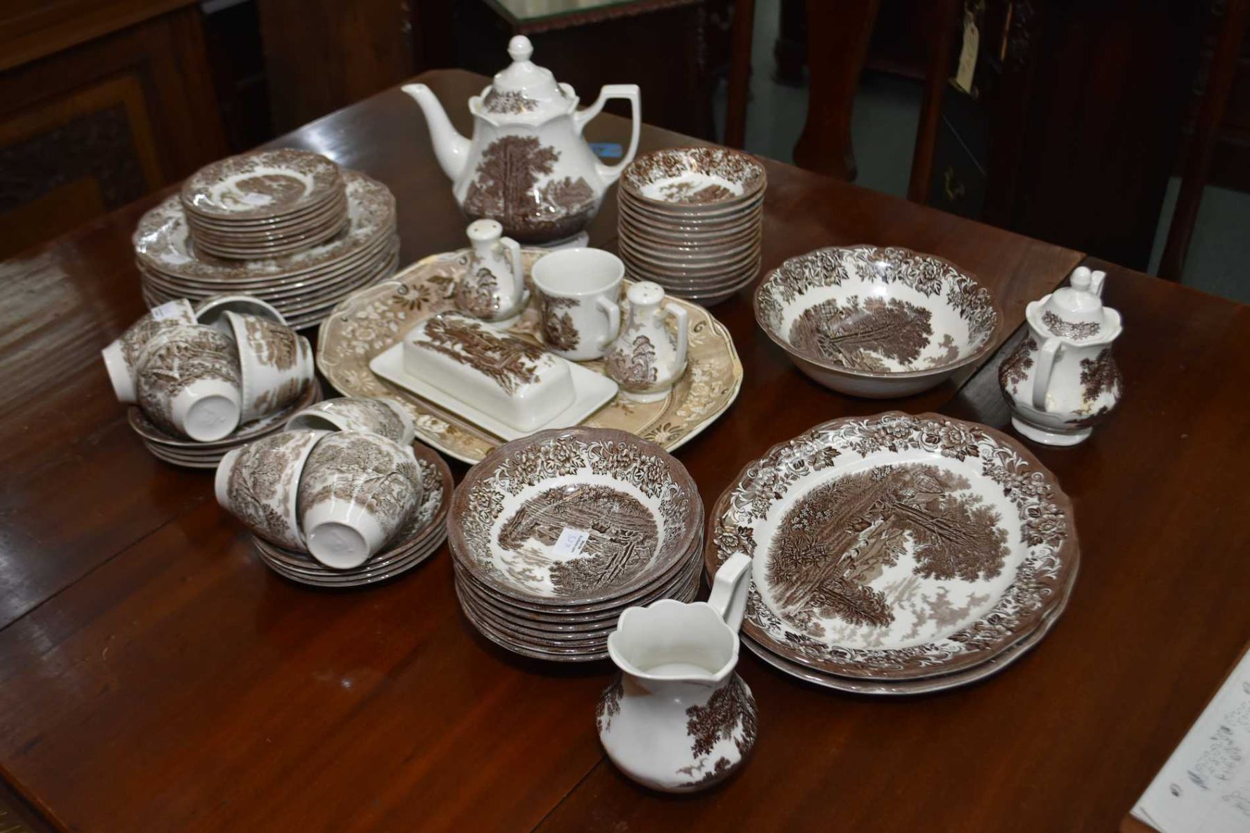 This Item Not Available For Shipping. Local Bidders Only. Set of Meakin ironstone dinnerware including setting for eight of dinner plates, side plates, cereal bowls, tea cups and saucer plus thirteen fruit nappies, tea pot, lidded sugar and creamer, shakers, lidded butter dish and a mismatched platter made by Spode etc.