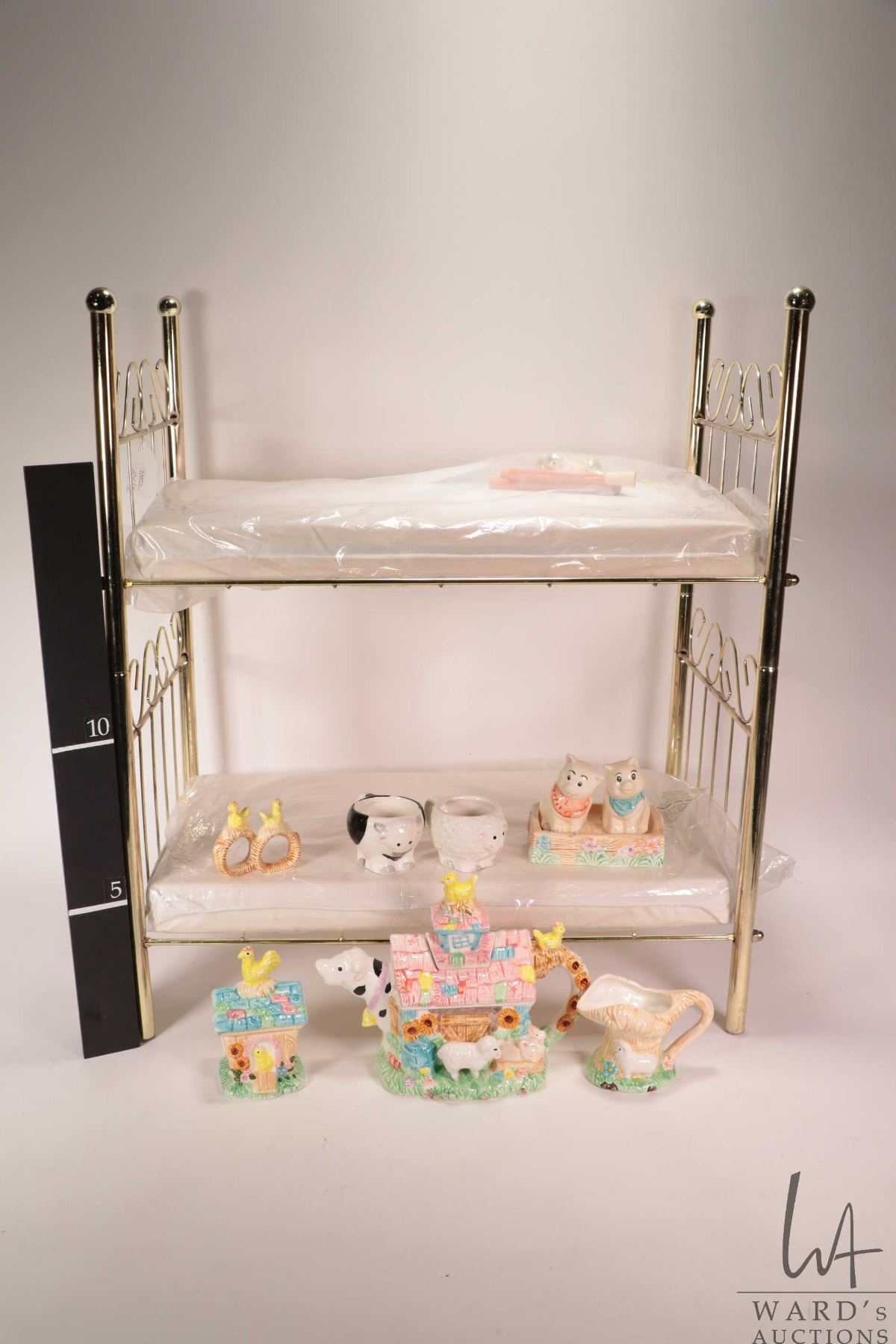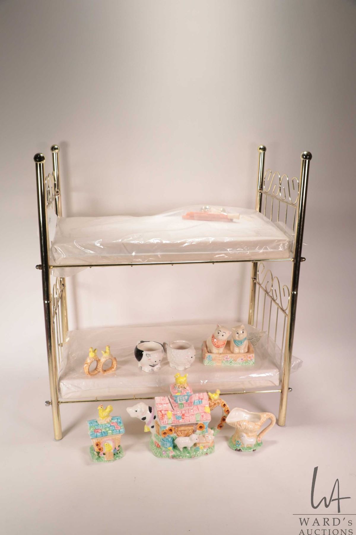 Set of dolls bunk beds in brass tone with mattresses, note: can be made into two single beds and a child's whimsical tea set