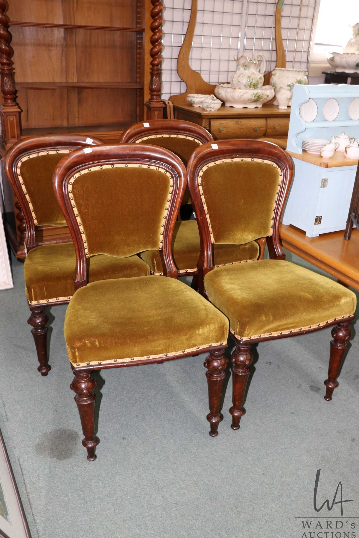 Set of four antique Victorian dining chairs with green velvet upholstery and nail head decoration