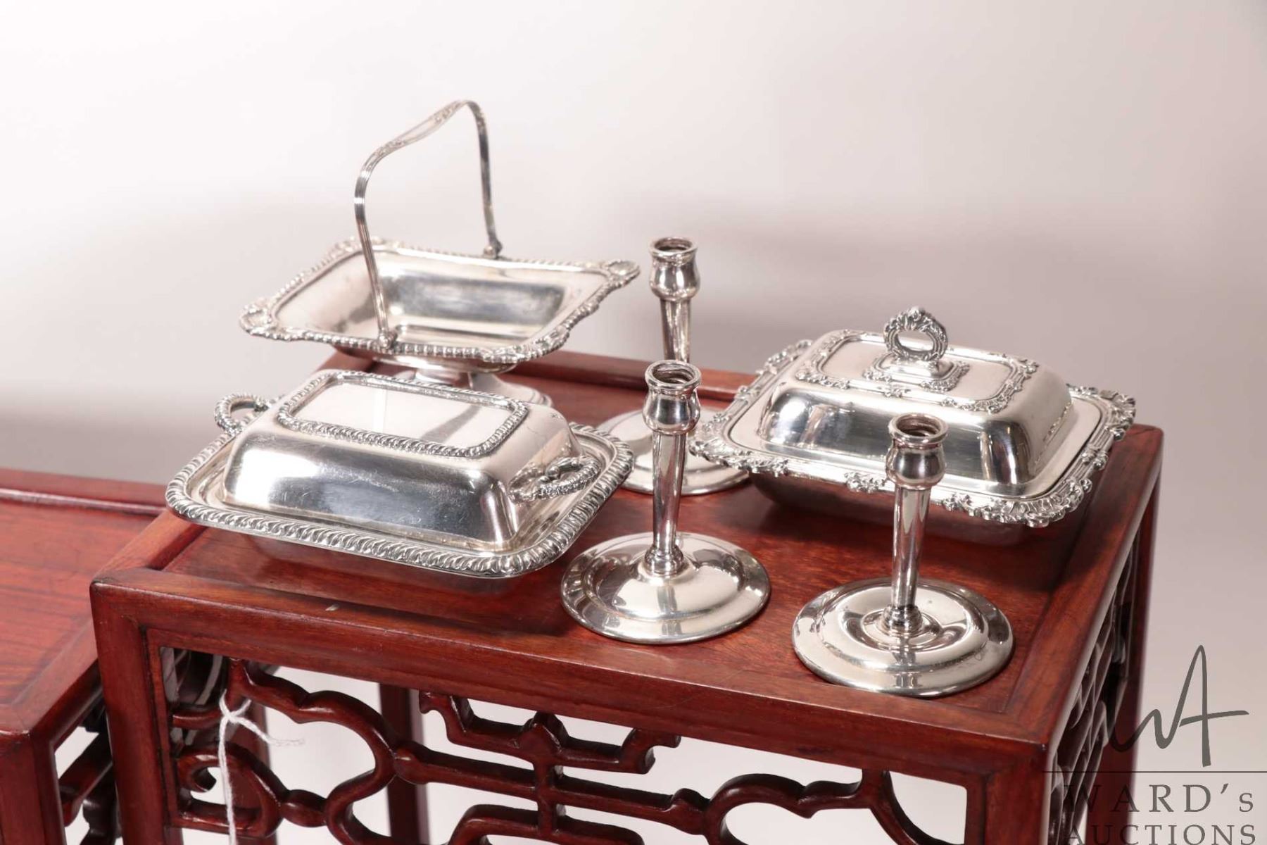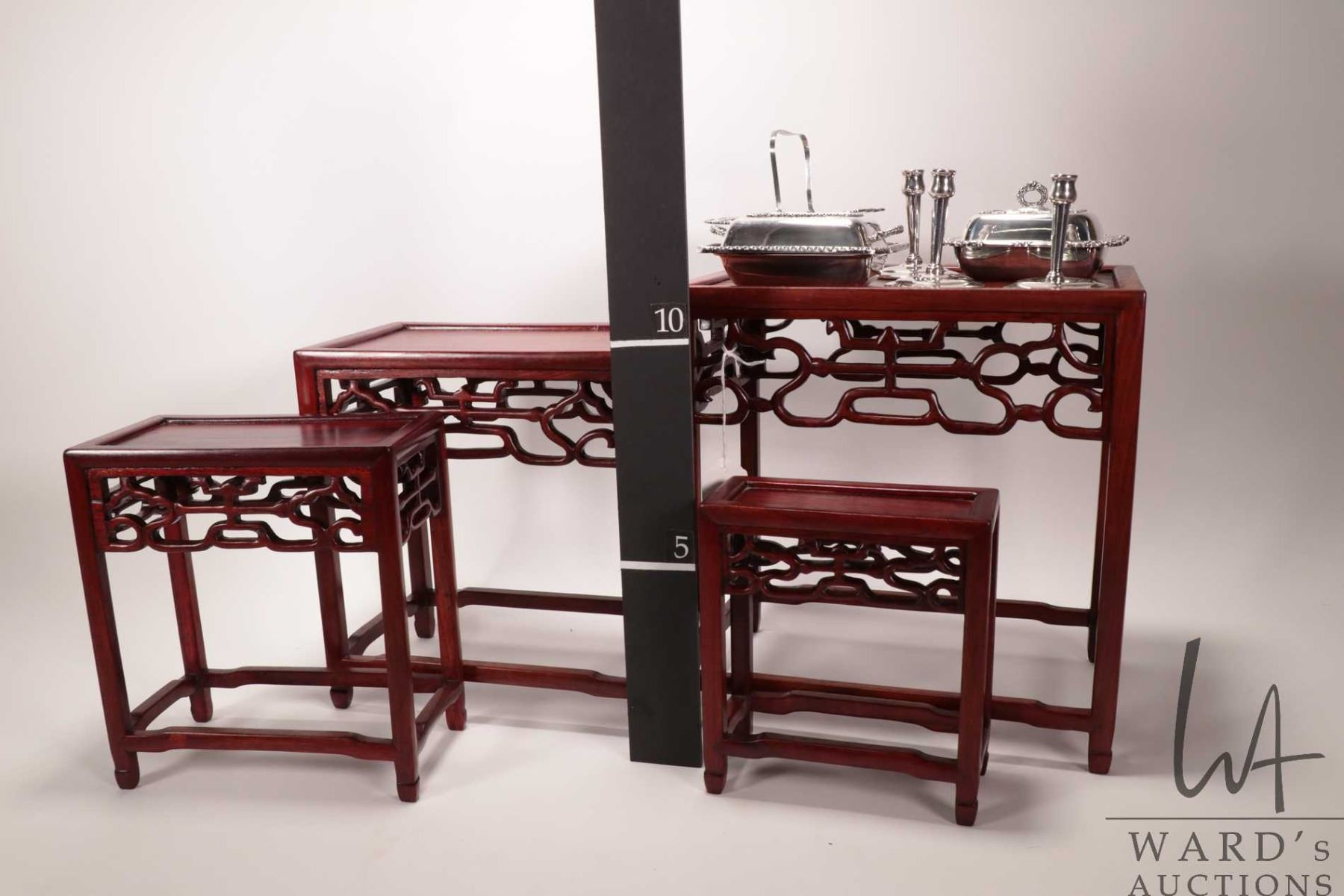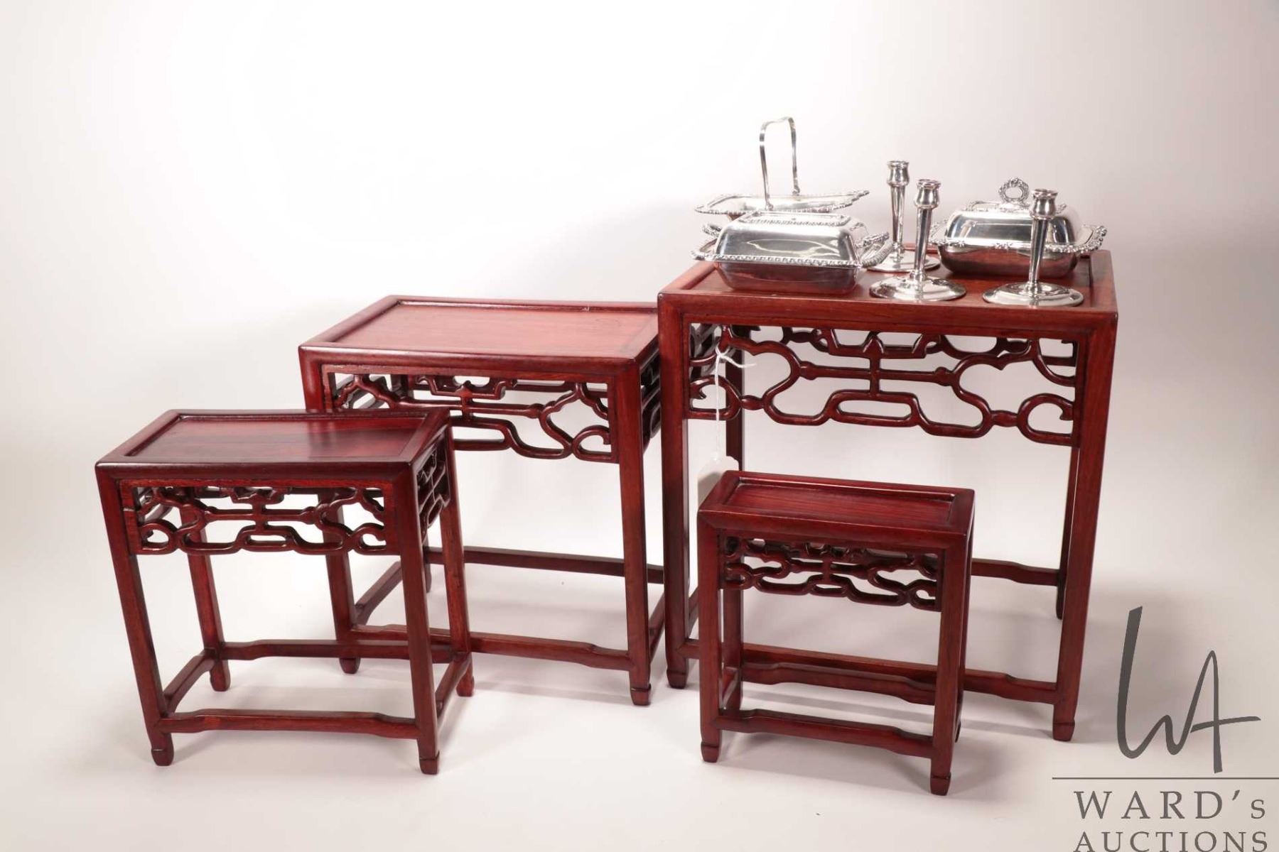Set of four diminutive set of Asian stacking tables, largest 11" in height and a selection of miniature silver plate casseroles and candlesticks