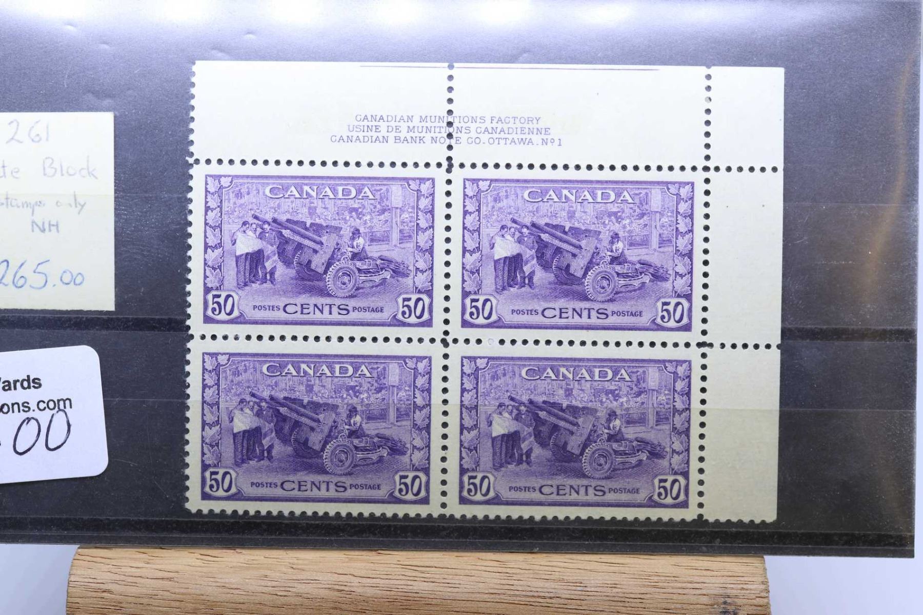 Set of four joined Canadian 50 cent postage stamps George VI "Canadian Munitions Factory" scott no. 261, top and side margin, in very fine condition
