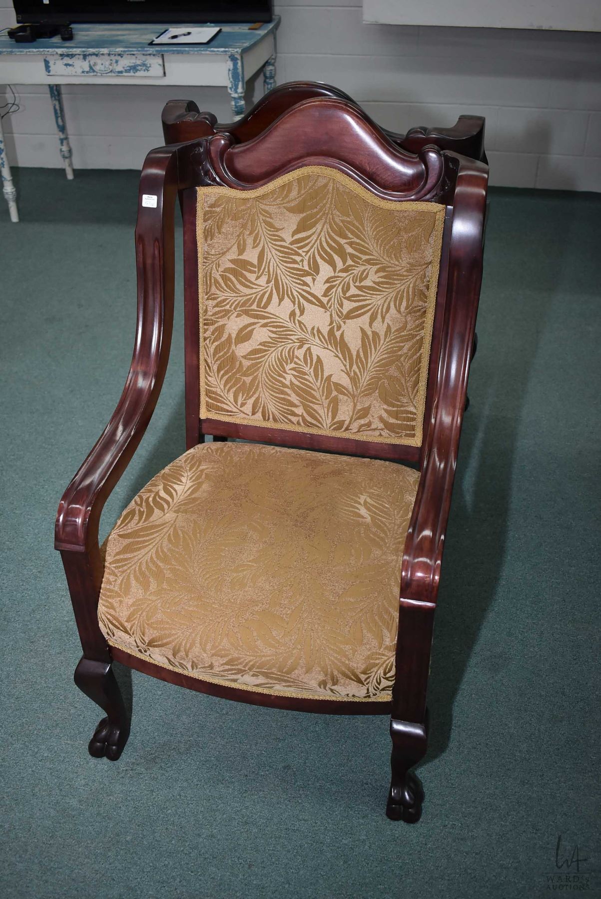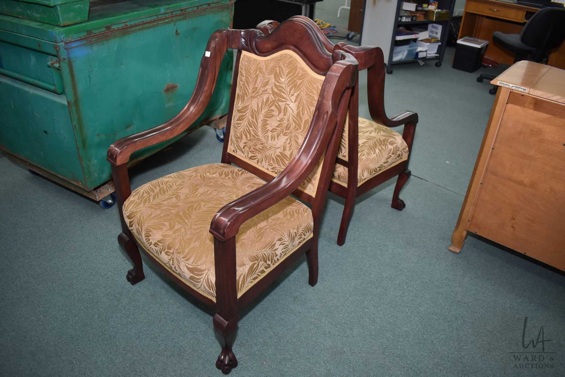 Set of his and hers wood framed arm chairs with damask style upholstery