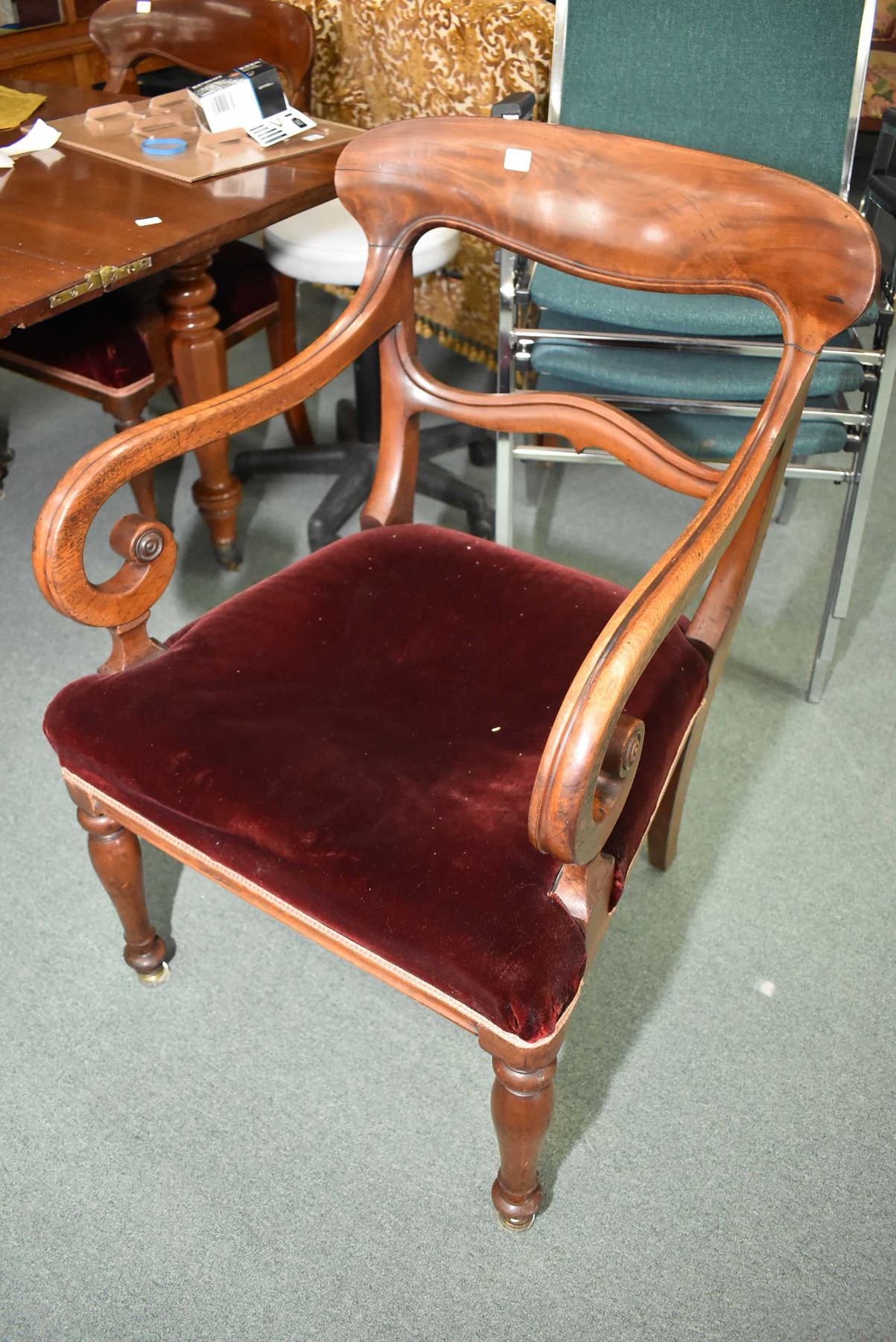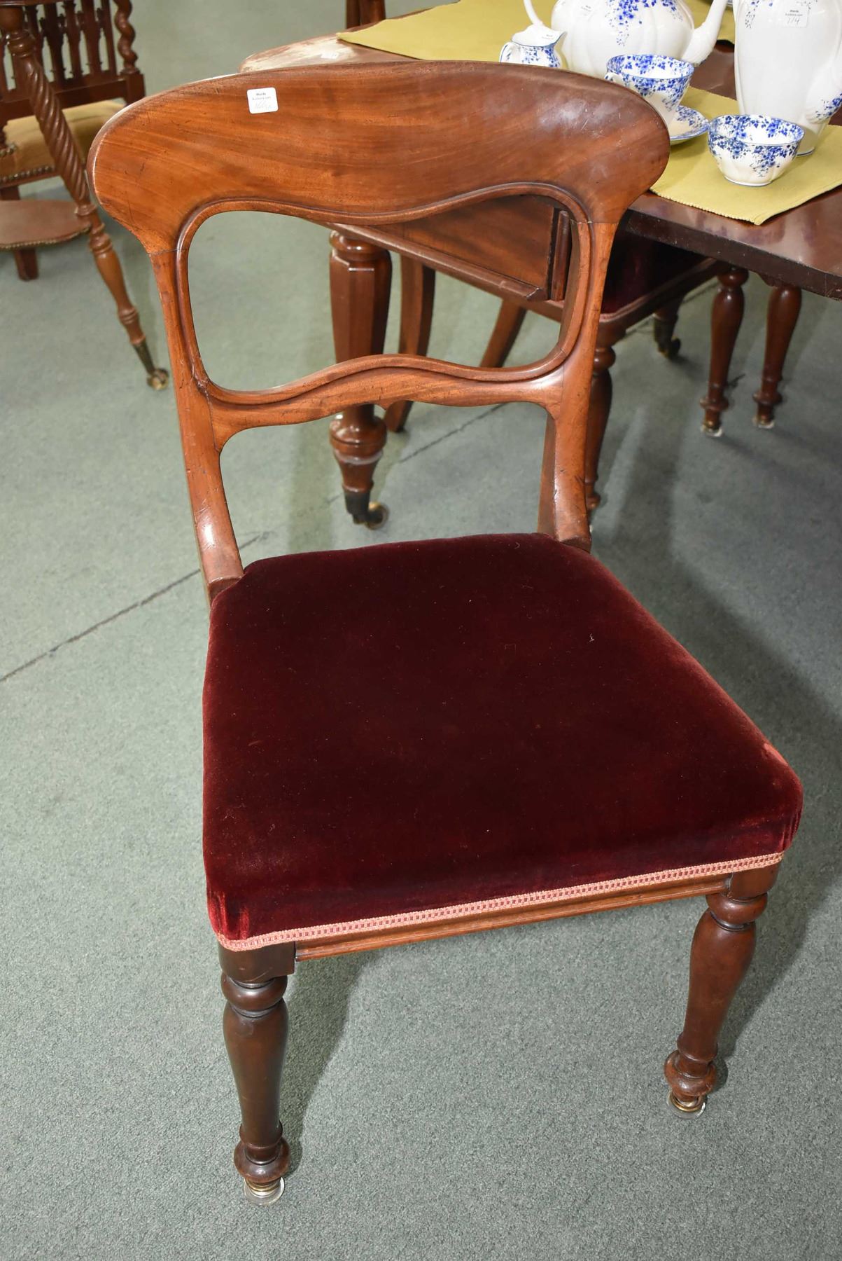 Set of seven antique mahogany William IV with velvet upholstered seats including five side chairs and two carvers