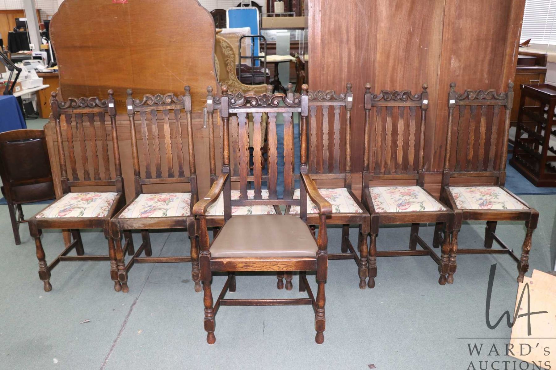 Set of seven matching antique slat back chairs with carved back supports, including six side chairs upholstered with floral fabric and carver in brown upholstery