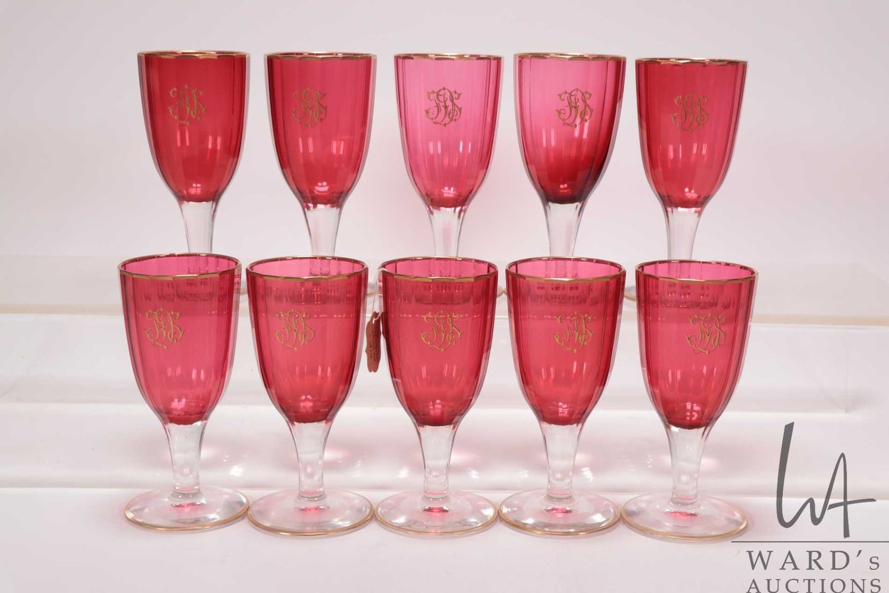 Set of ten antique French cut crystal cranberry wine glasses, purportedly circa 1820, with gilt edging and initials, each 5 1/2" in height