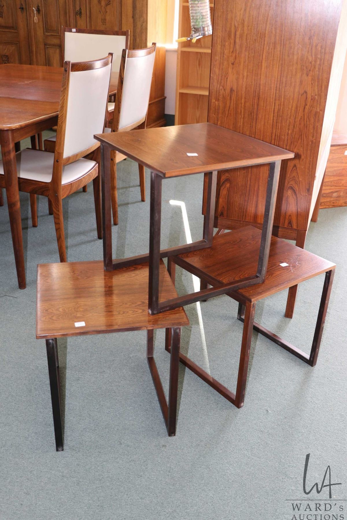 Set of three mid century modern cherry wood interlocking occasional tables, designed to form a cube