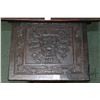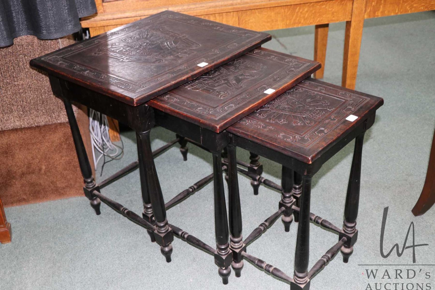Set of three vintage Peruvian mohen wood and tooled leather nest of tables, each with spiritual imagery, circa 1940's, largest 24" X 22" X 18"
