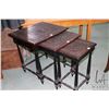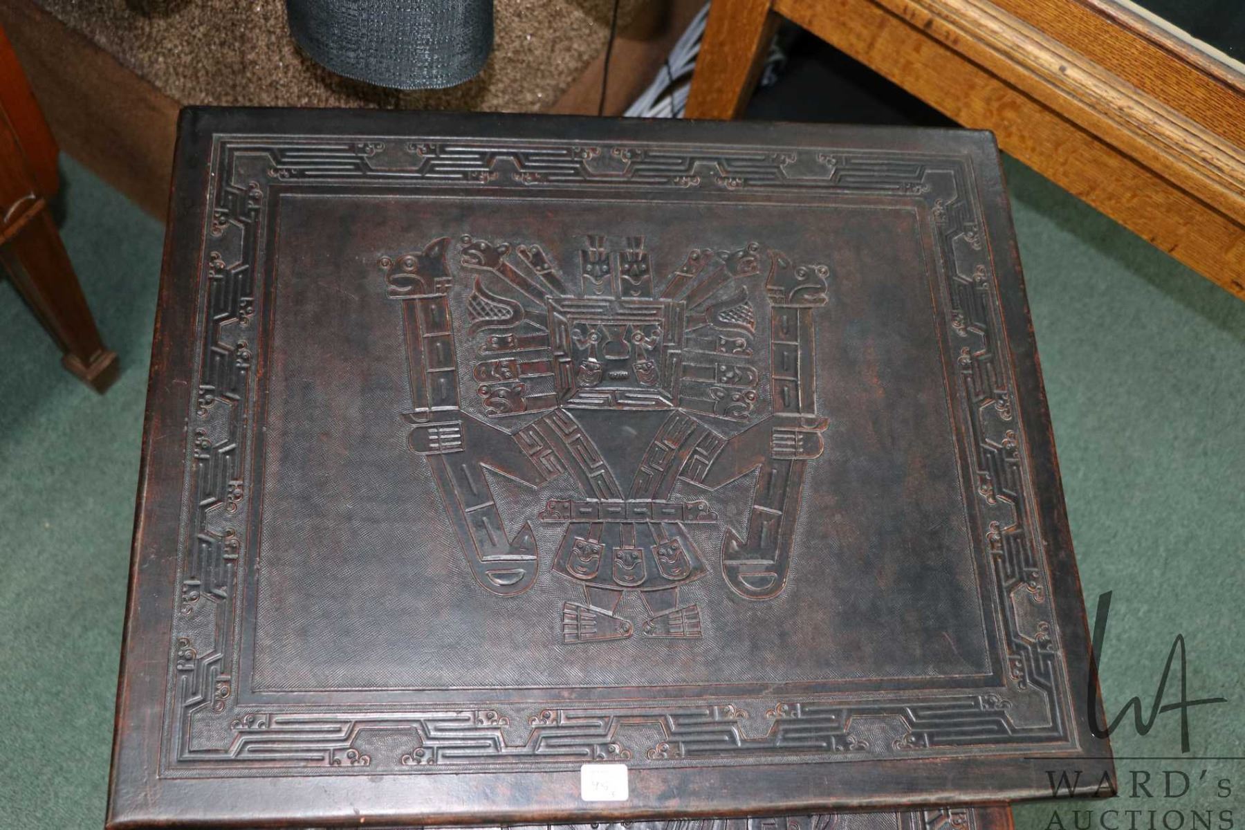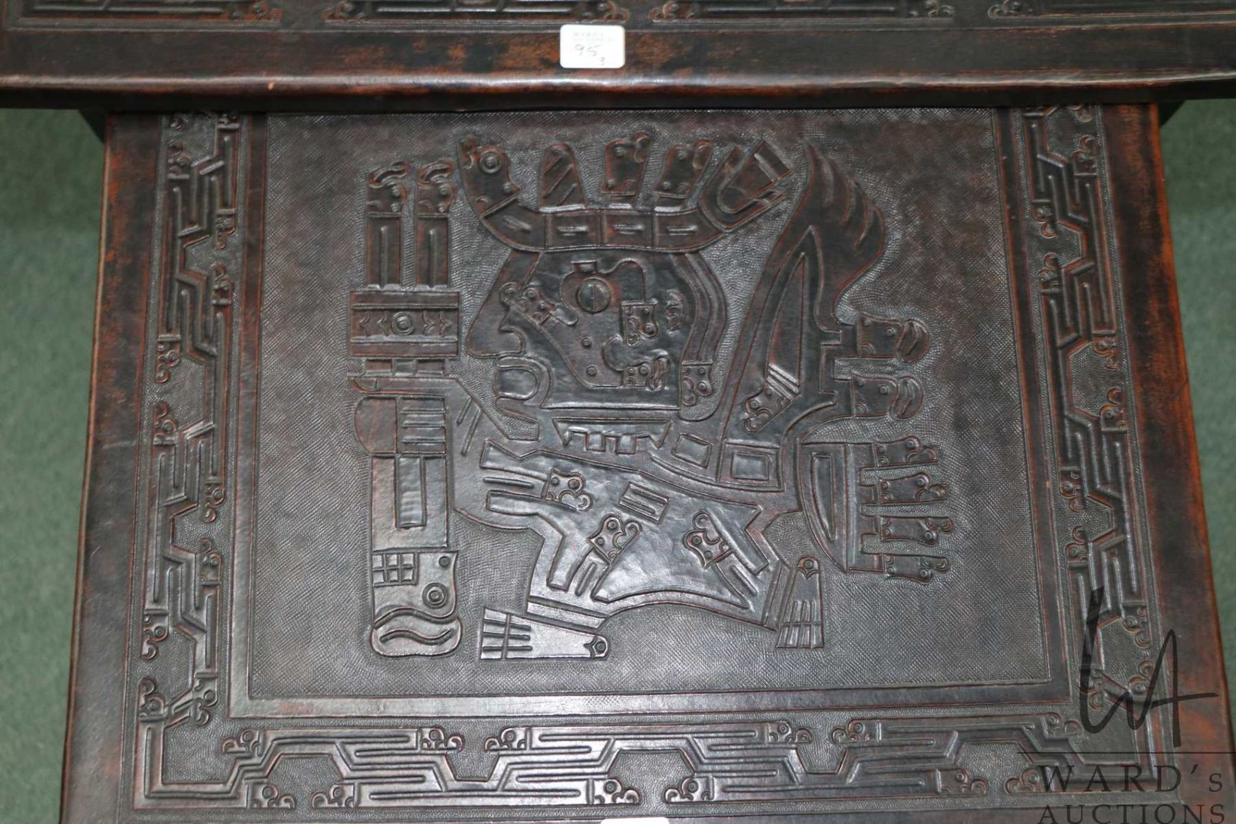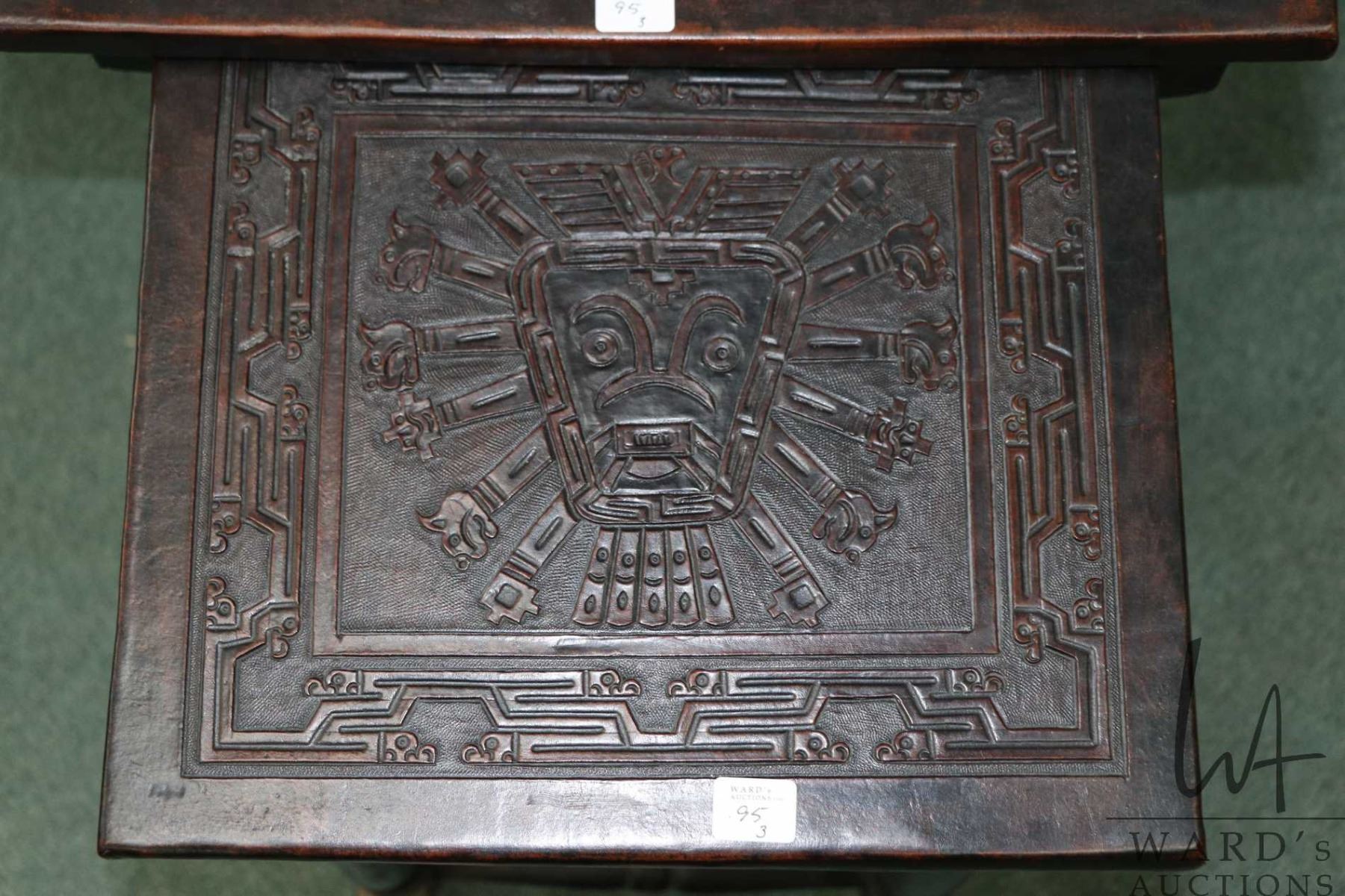 Set of three vintage Peruvian mohen wood and tooled leather nest of tables, each with spiritual imag