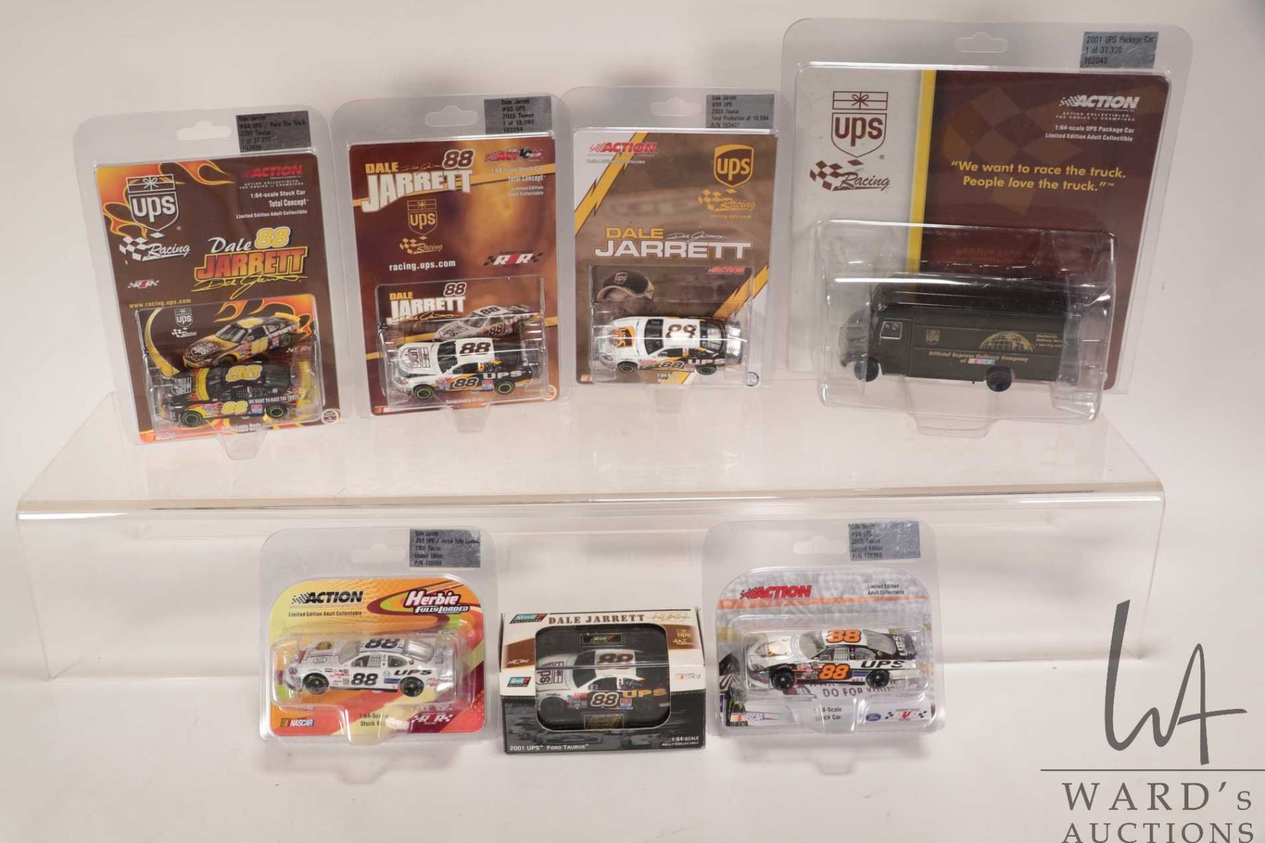 Seven 1: 64 scale die cast collectible cars including six Dale Jarrett 2001-2005 race cars and a UPS delivery van