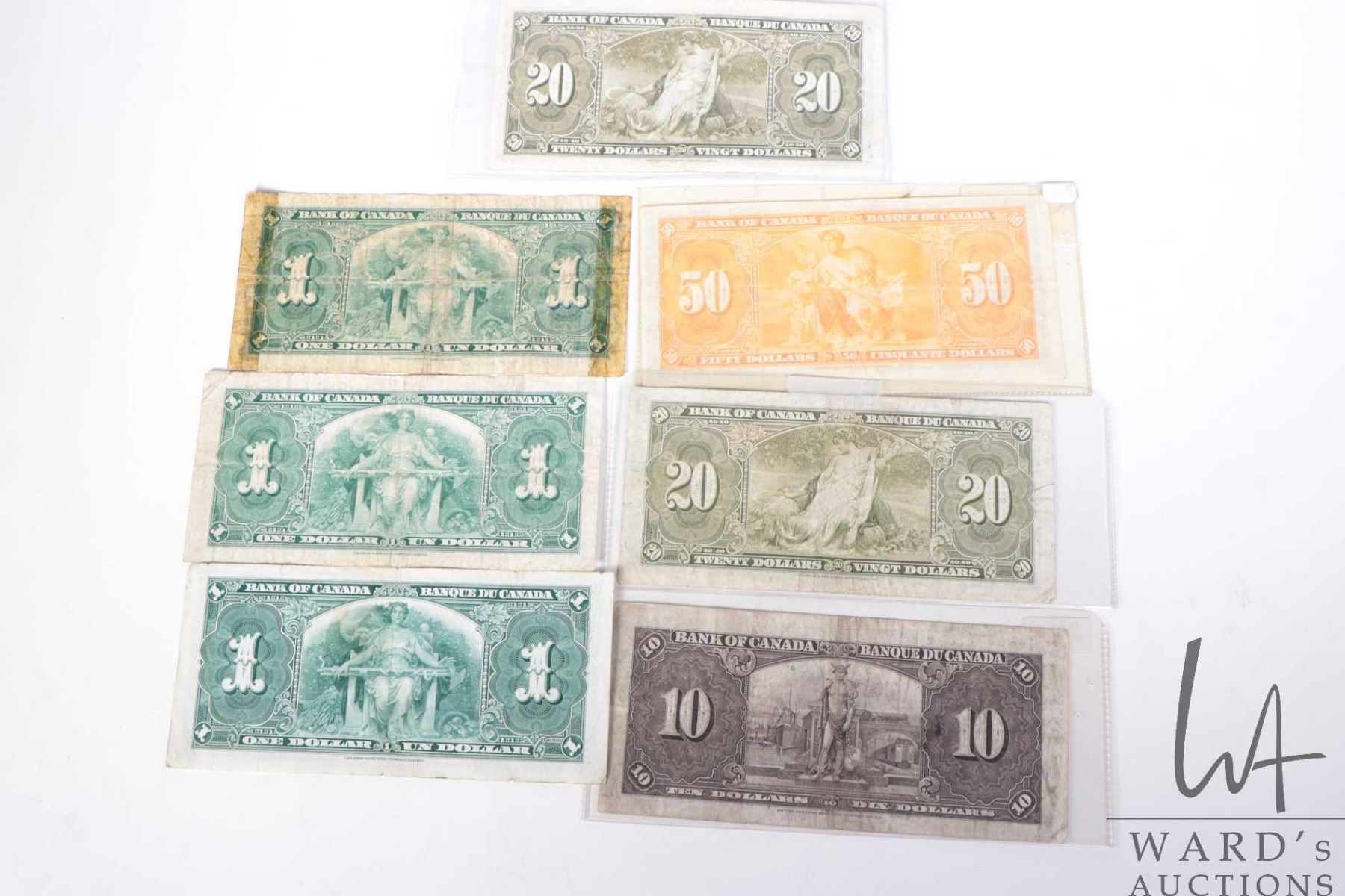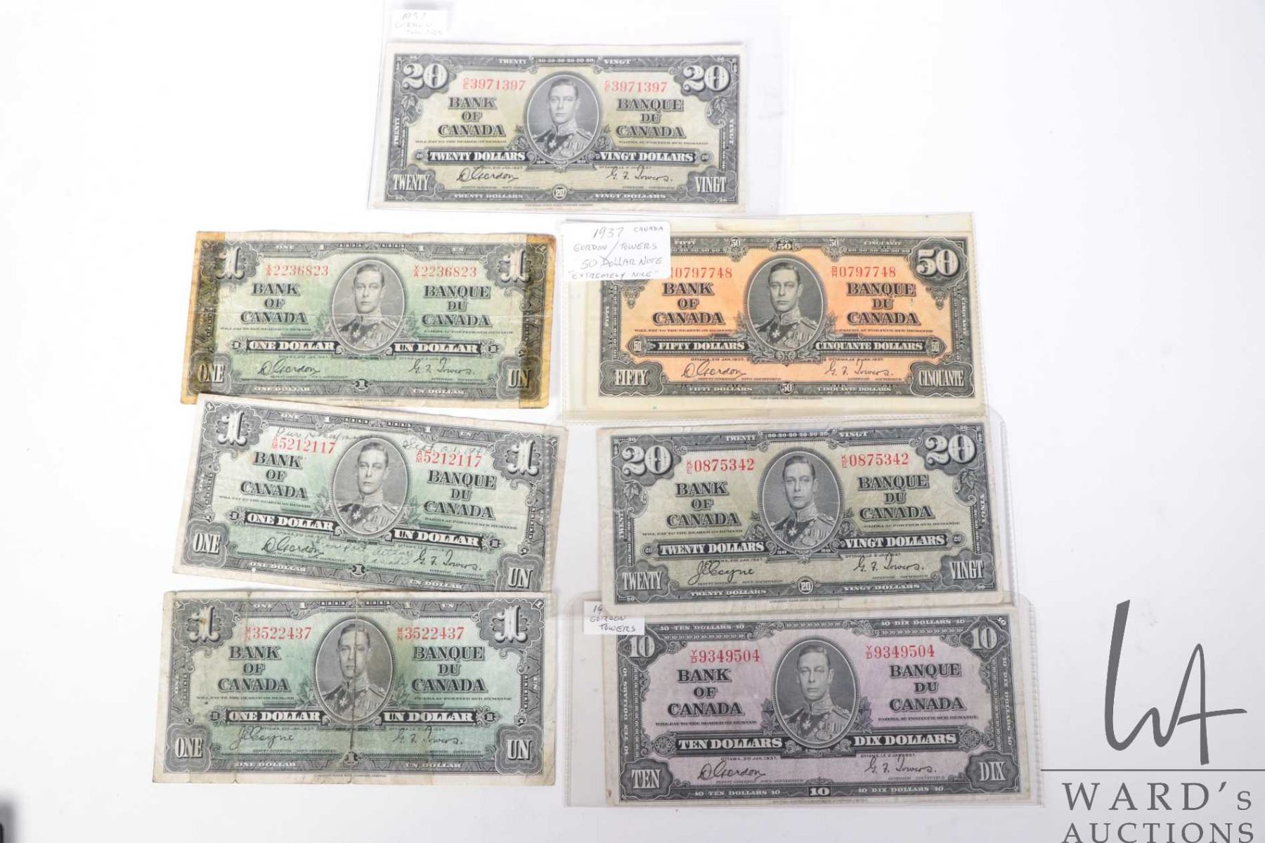 Seven 1937 Gordon Towers Canadian bank notes including $50 dollar bill, two $20 dollar bills, one $10 bill and three $1 dollar bills