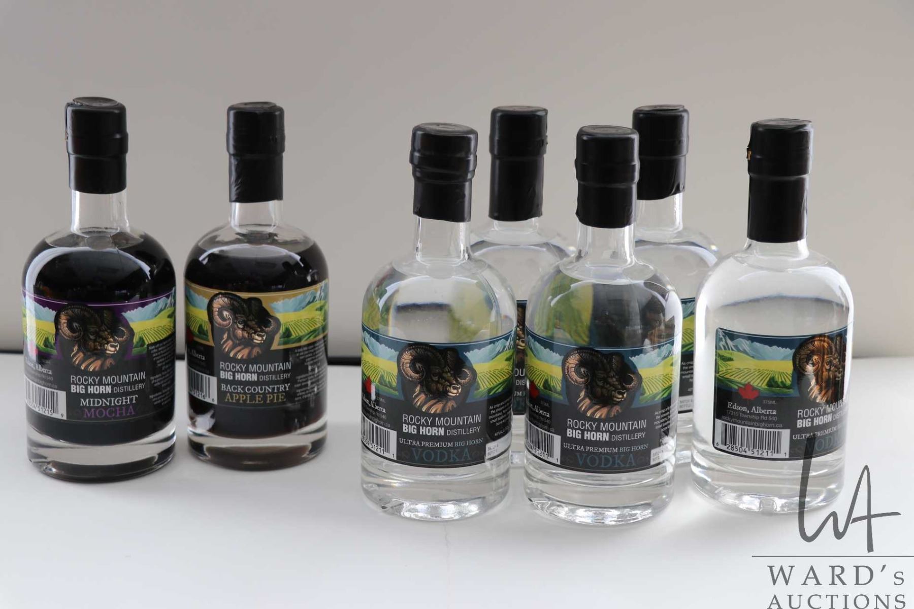 Seven 375ml bottles of Rocky Mountain Big Horn including five premium vodka / 40% ABV, one Back Country Apple Pie / 30% ABV and one Midnight Mocha / 30% ABV Note: Alcohol cannot be insured by any courier in Canada. Local pick up is recommended. Canadian bidders only