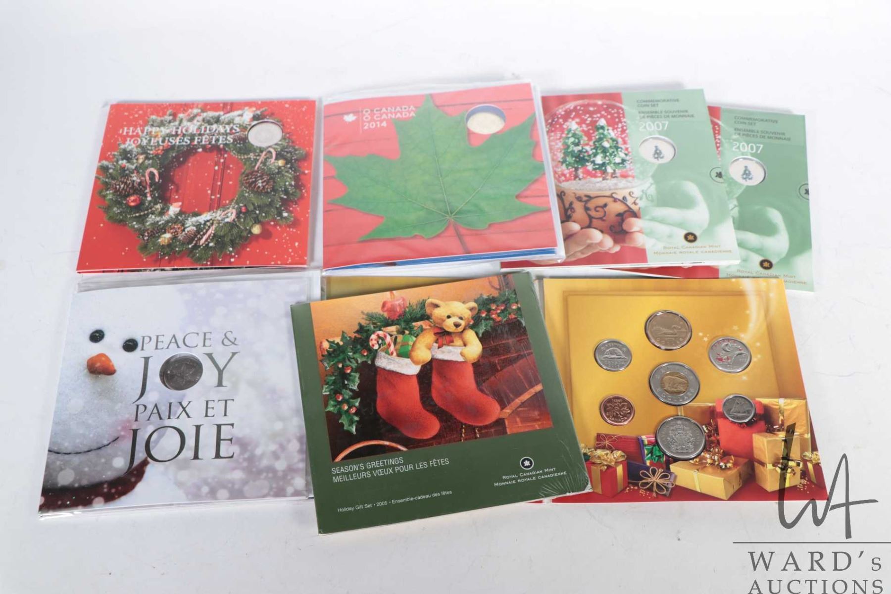 Seven Canadian Specimen sets including 2005, 2006, two 2007, 2011, 2013, 2014, all in holiday theme Christmas packaging