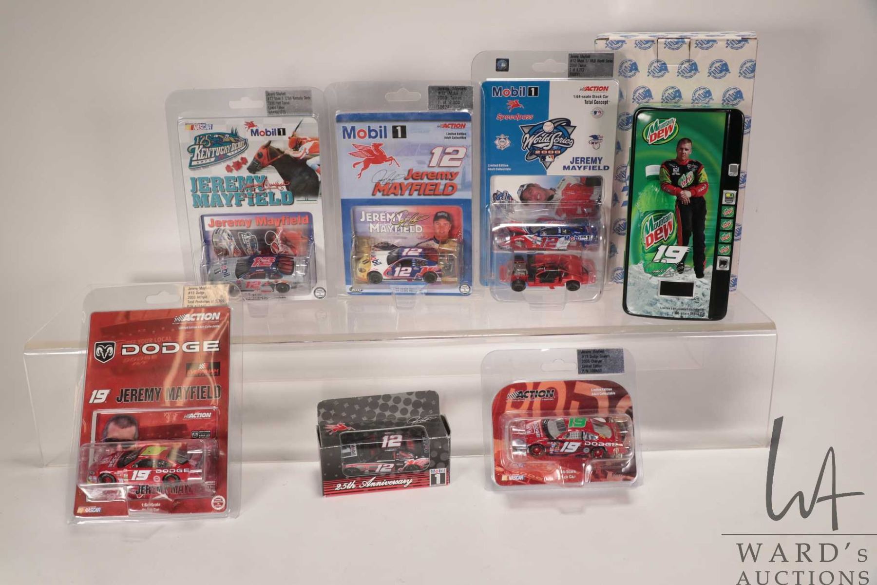 Seven Jeremy Mayfield limited edition 1: 64th scale die-cast cars, assorted themes including Mobil 1, Kentucky Derby, World Series and Mountain Dew
