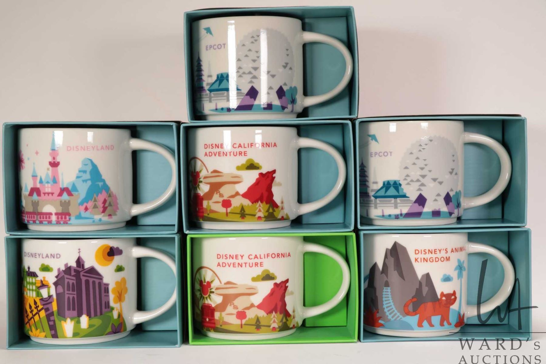 Seven Starbucks coffee mugs Disney Parks "You Are Here" collection featuring Orlean Square with purple haunted mansion plus Epcot, California Disney Adventure etc.