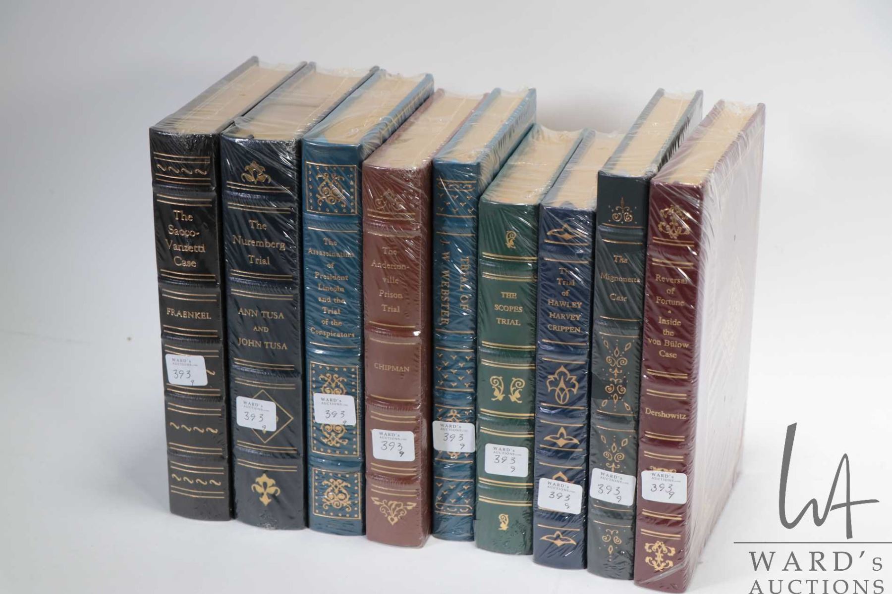 Seven gilt paged and leather bound books from "The Notable Trials Library" including "The Mignonette Case", "Reversal of Fortune: Inside the von Bulow Case, "The Nuremberg Trail", "The Assination of President Lincoln and the Trial of the Conspirators", The Scopes Trial", "Trail J. W. Webster", "The Trial of Hewley Harvey Crippen", "The Andersonville Prison Trial" and "The Sacco Vanzetti Case
