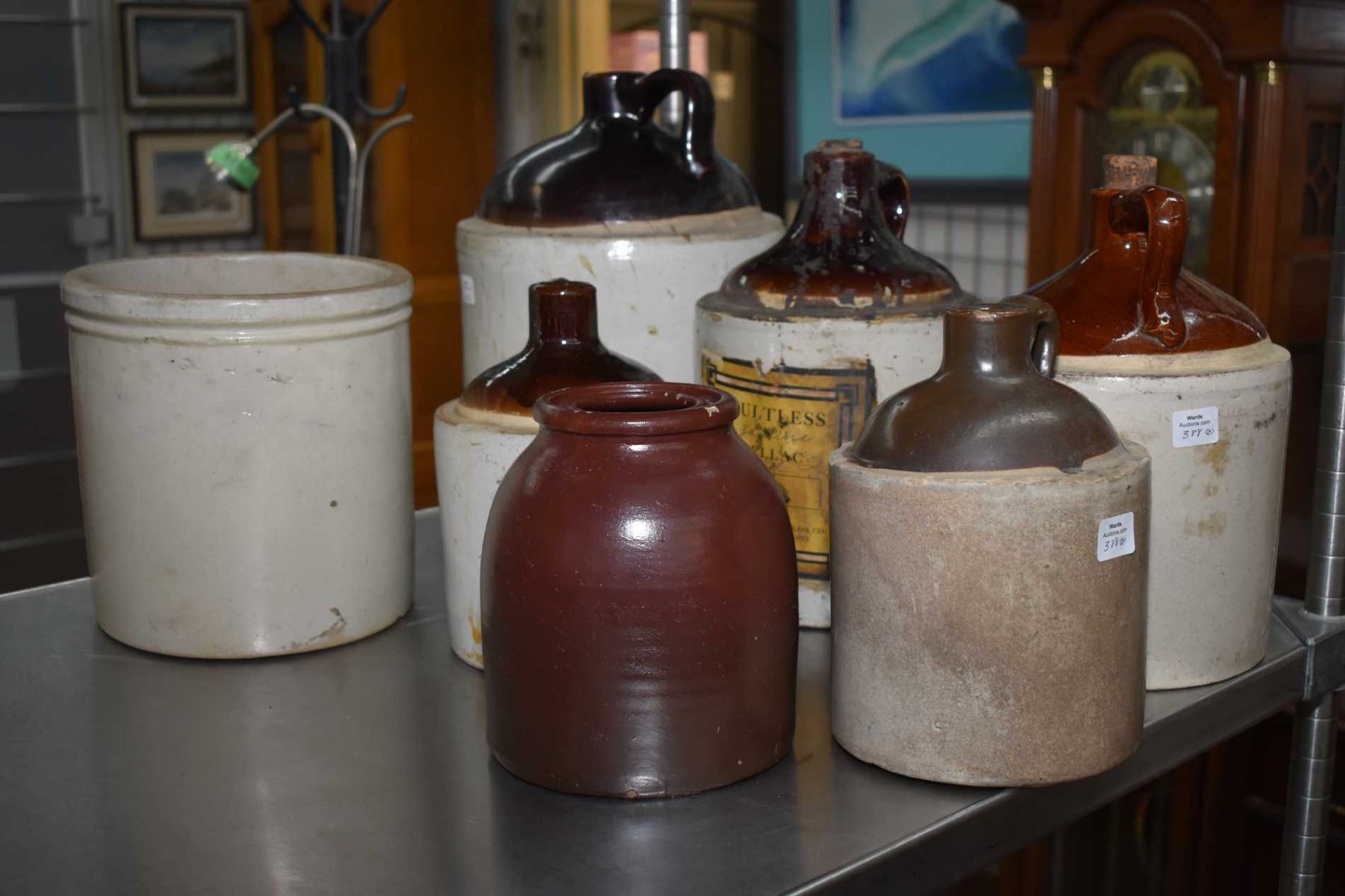 Seven pieces of vintage stoneware including five assorted jugs and one glazed crock and one stoneware crock