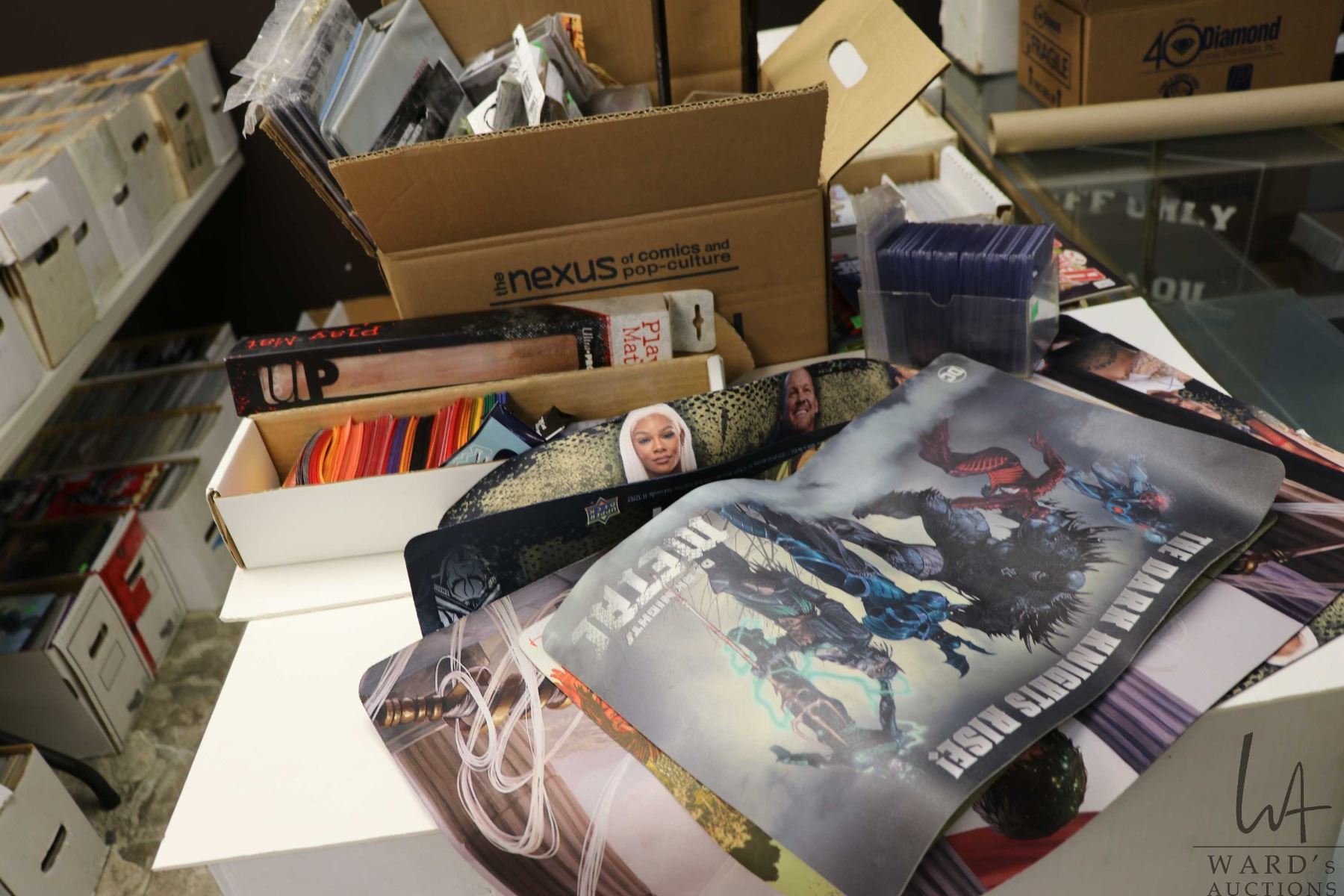 Seven playmats plus a selection of binders, card sleeves and card holders. No cards included. Important: Pickup is in Edmonton. Long comic boxes (28 x 8 x 11.5 and 23kg) will be shipped in 2 boxes approximately 11 x 9 x 12 and 13kg each through Canada Post. Long boxes can be palletized for large invoices. Details to follow