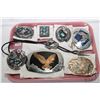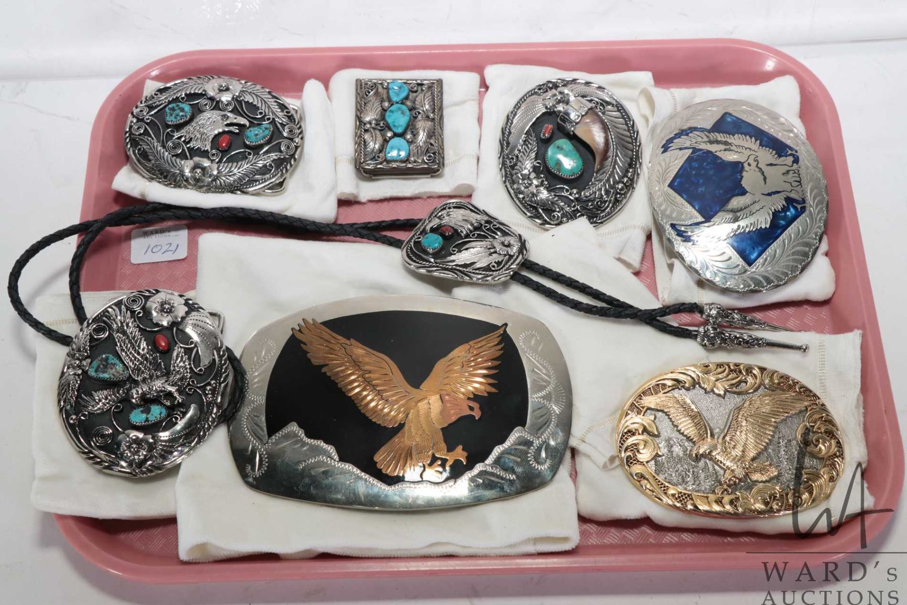 Seven silver and silver like belt buckles with decorative torquoise and coloured stones and on lariat tie
