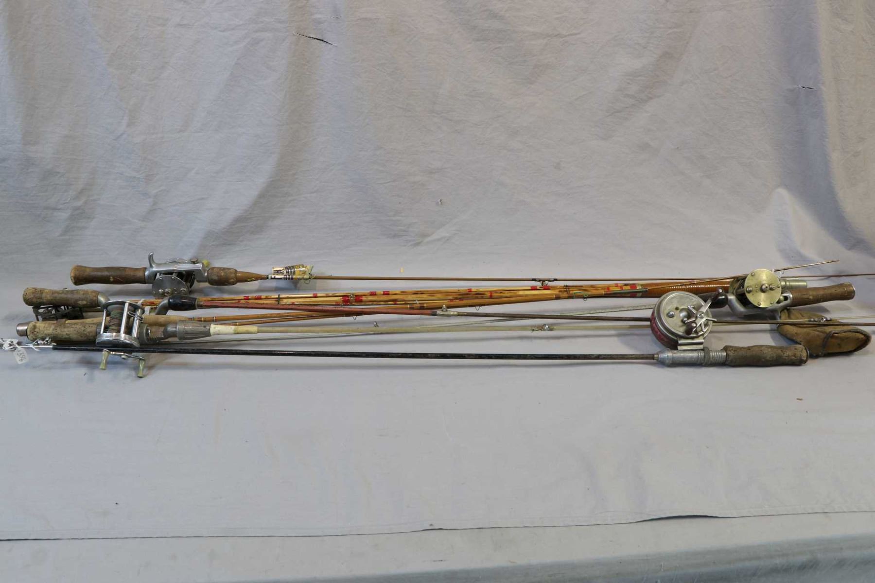 Seven vintage fishing rods including split cane, metal etc., some with reels including Good-All etc.