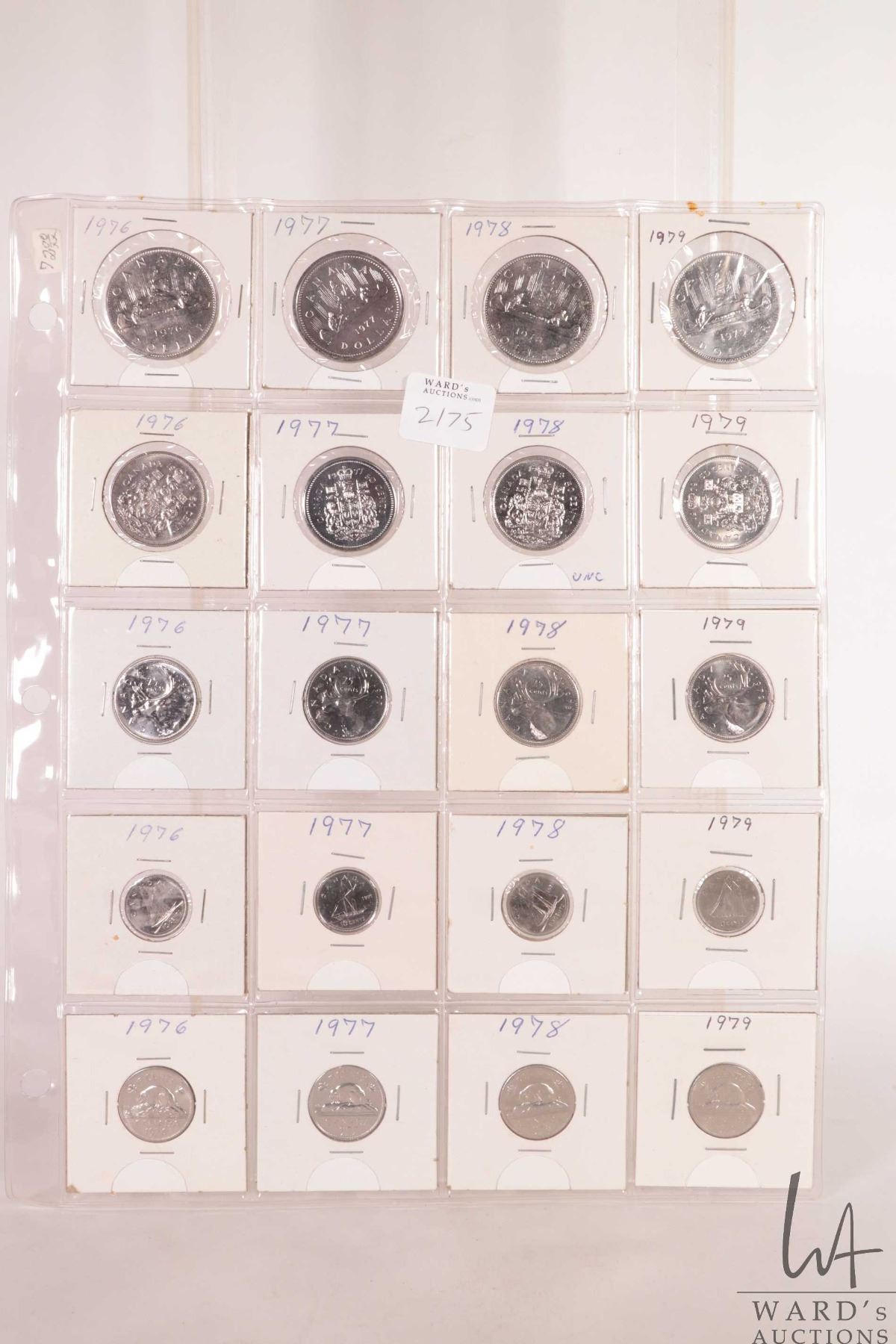 Sheet containing Canadian coins including dollar, fifty cent, quarter, dime and nickels for the years: 1976, 1977, 1978 and 1979