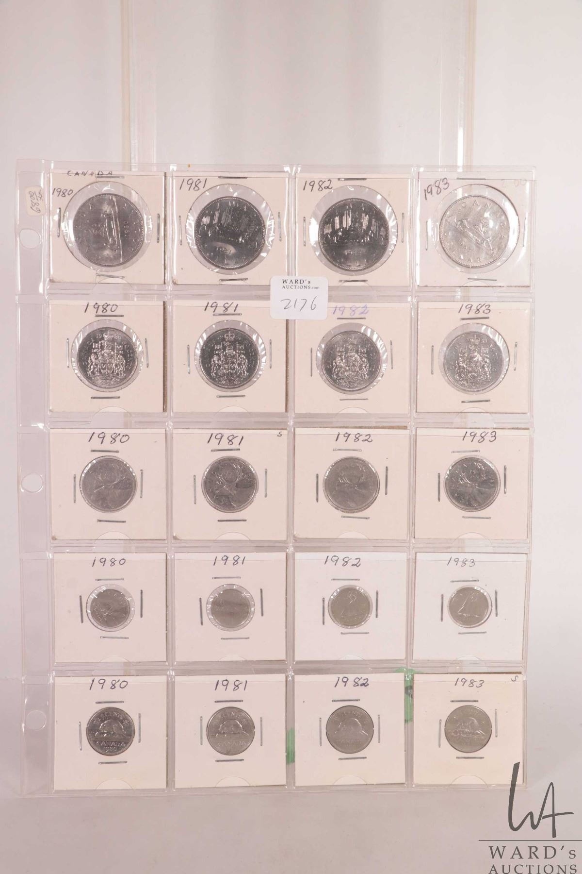 Sheet containing Canadian coins including dollar, fifty cent, quarter, dime and nickels for the years: 1980, 1981, 1982 and 1983