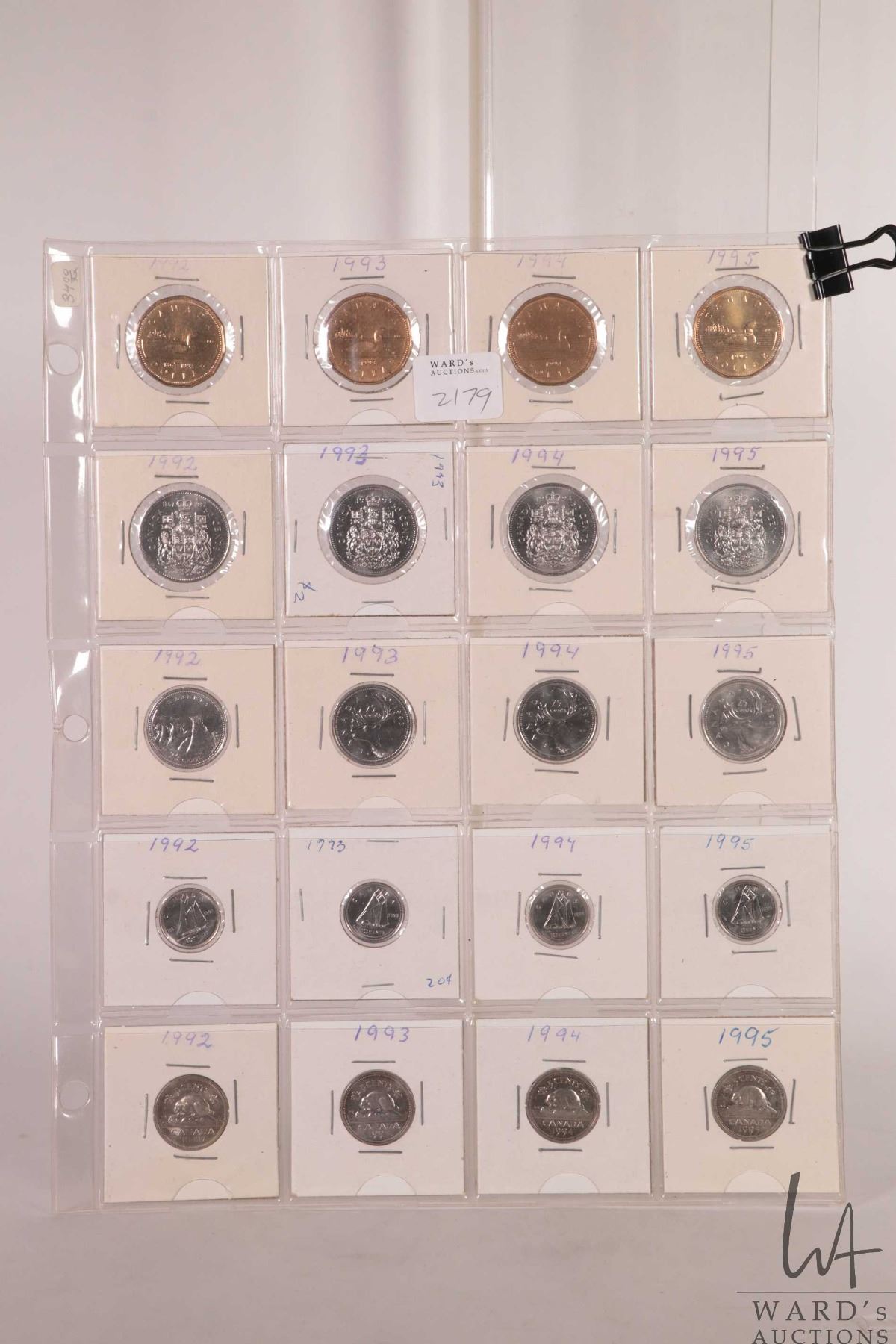 Sheet containing Canadian coins including dollar, fifty cent, quarter, dime and nickels for the years: 1992, 1993, 1994 and 1995
